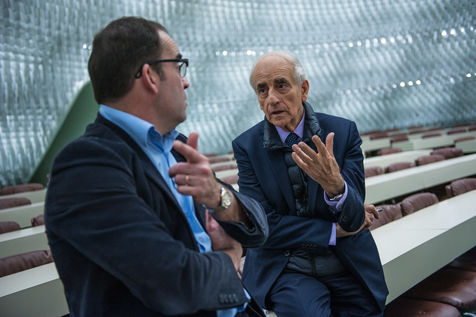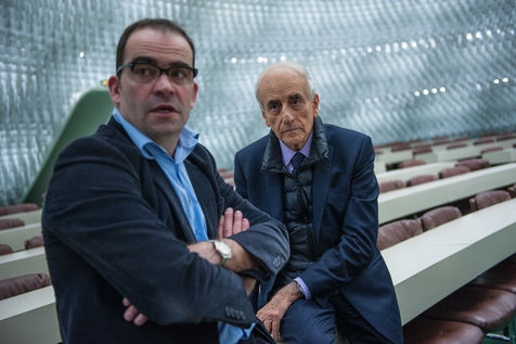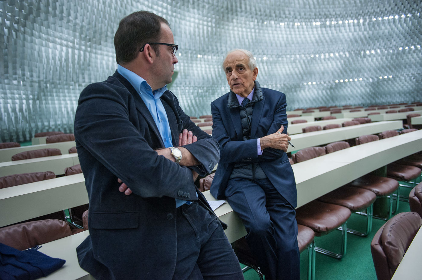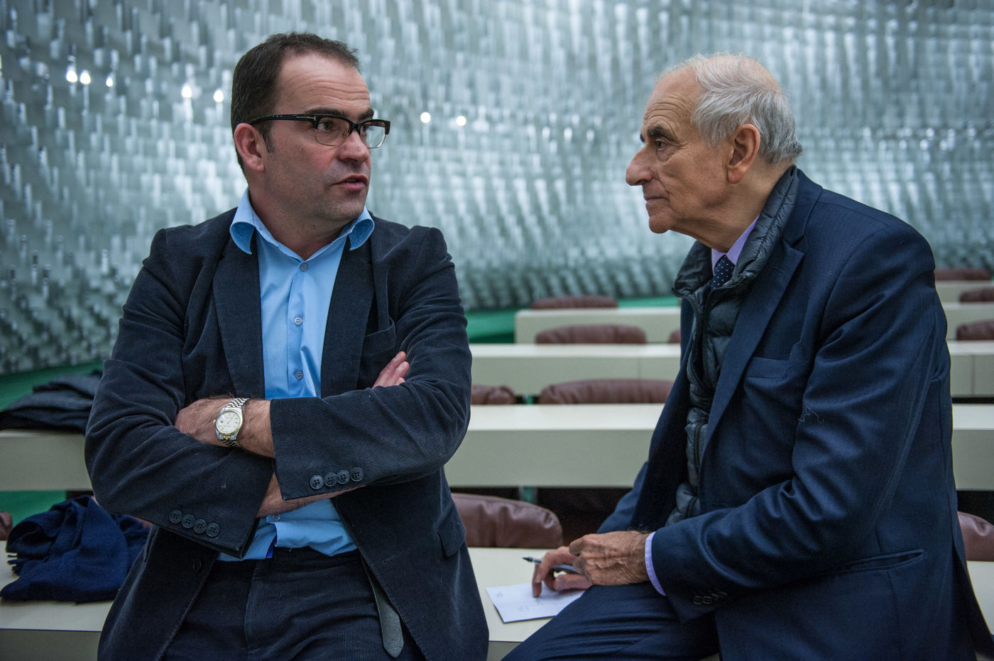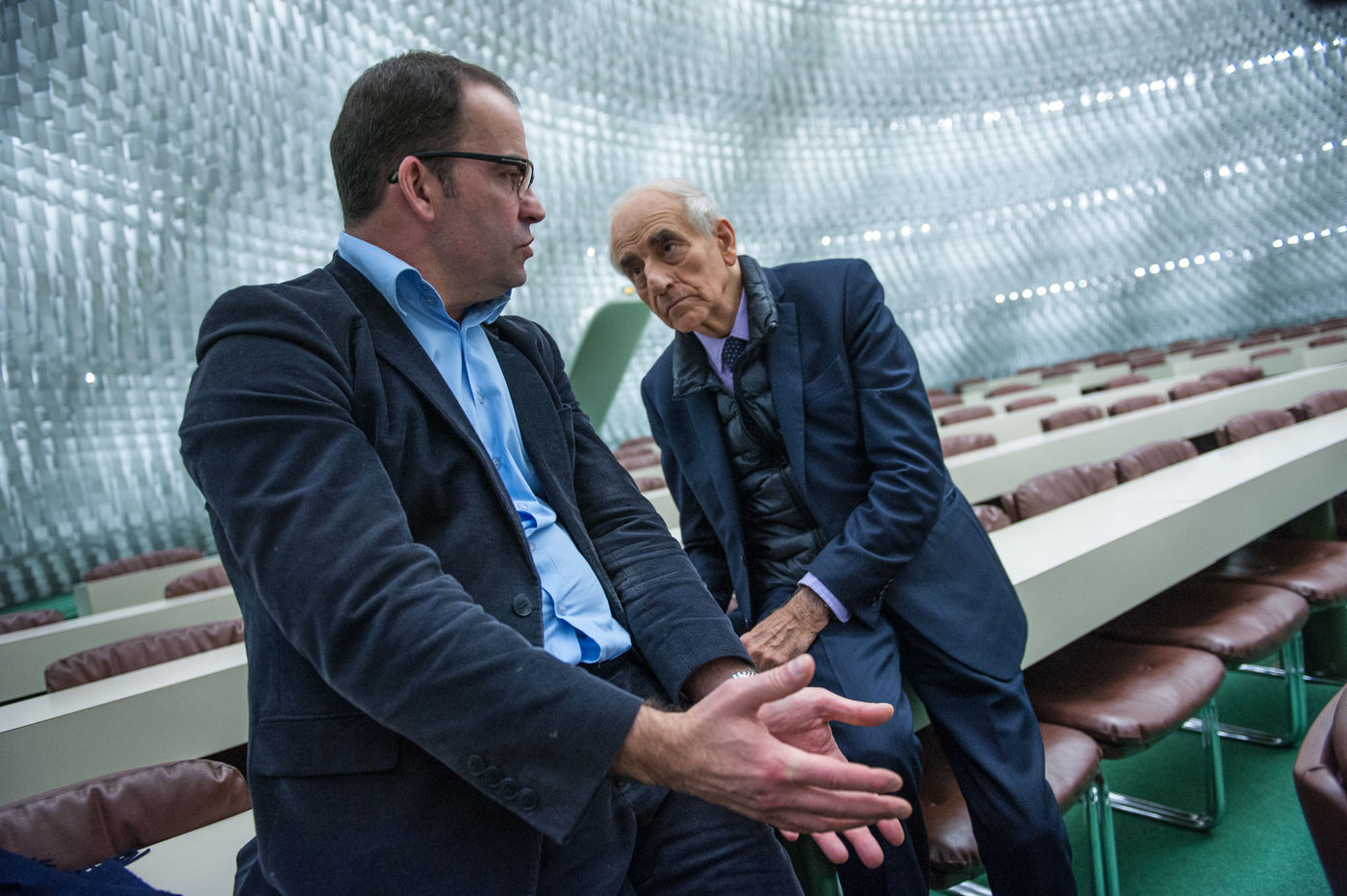 29 novembre 2017 Paris siege du PCF Colonel Fabien. Jean-Pierre Elkabbach et Olivier Marchais , fils de Georges Marchais visitent l'exposition consacrée à son père. Les deux hommes s'entretiennent afin de préparer une émission sur CNews.