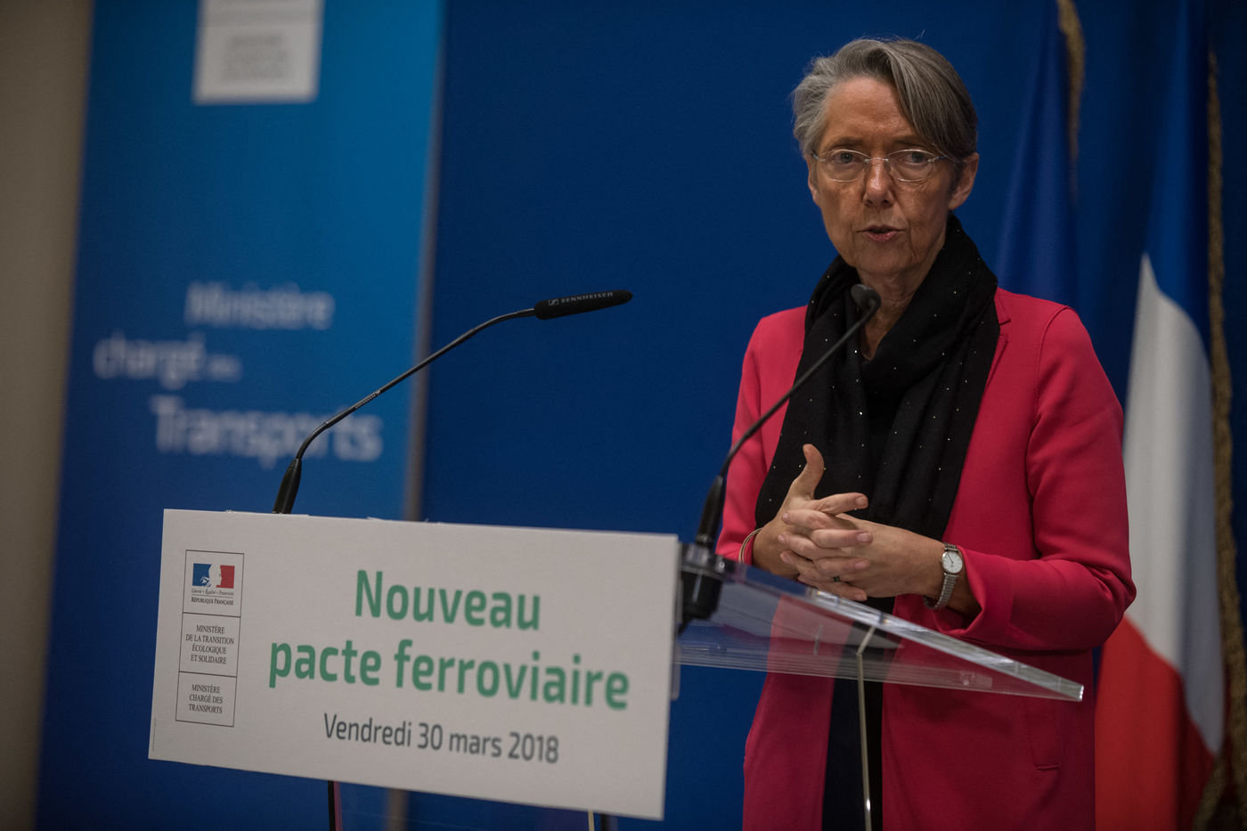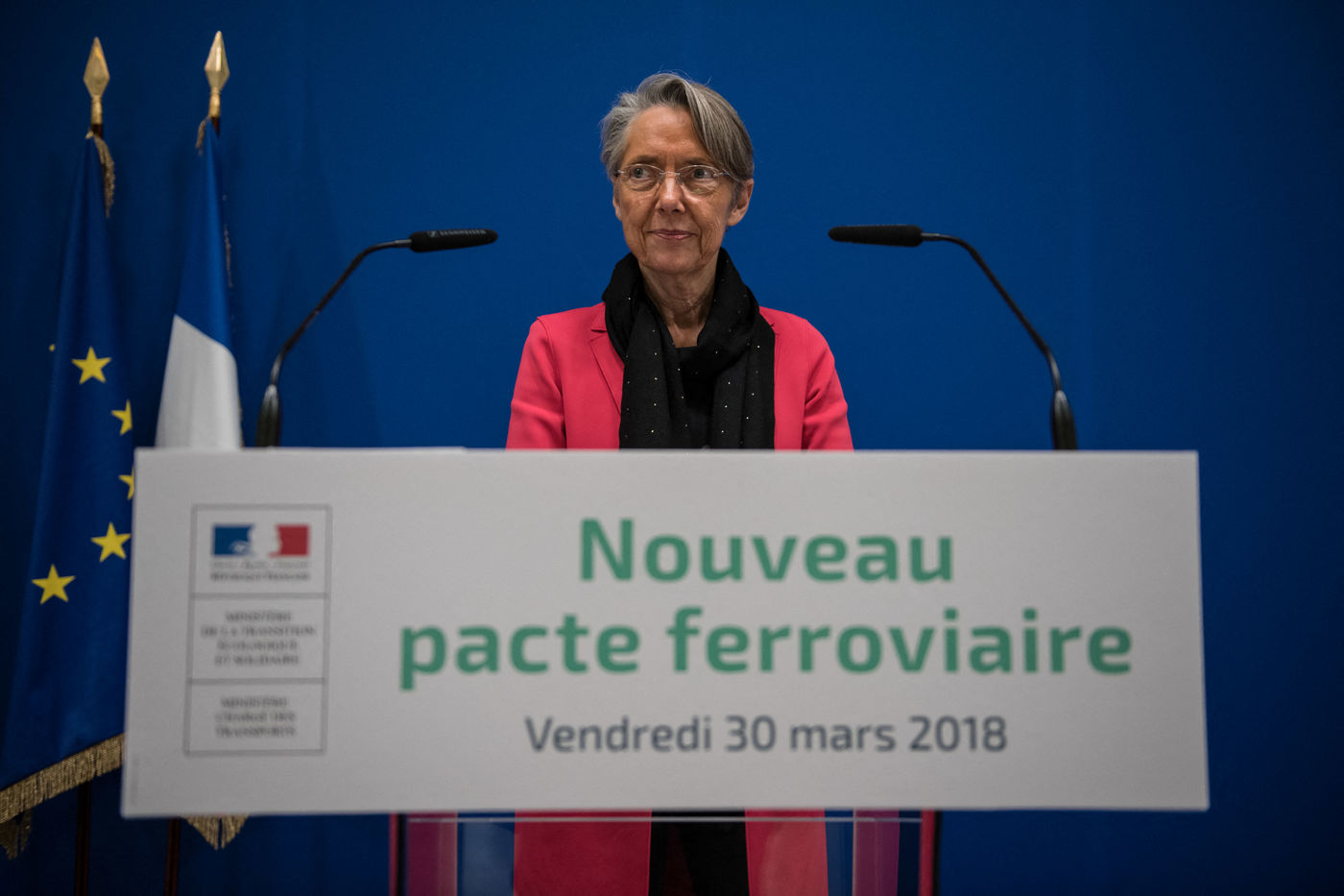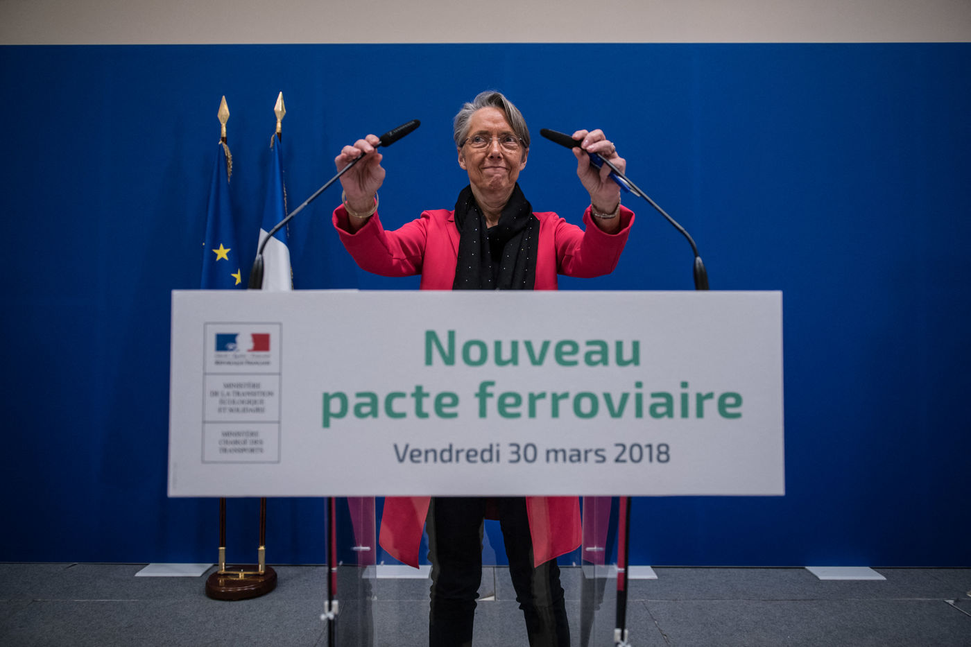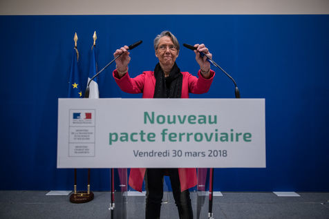 30 mars 2018 Paris ministère du développement durable. Conférence de presse de la ministre du transport Elisabeth Borne suite à la rencontre avec les syndicats sur le projet de réforme de la SNCF et de son ouverture à la concurrence.