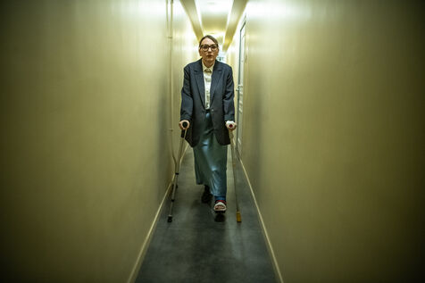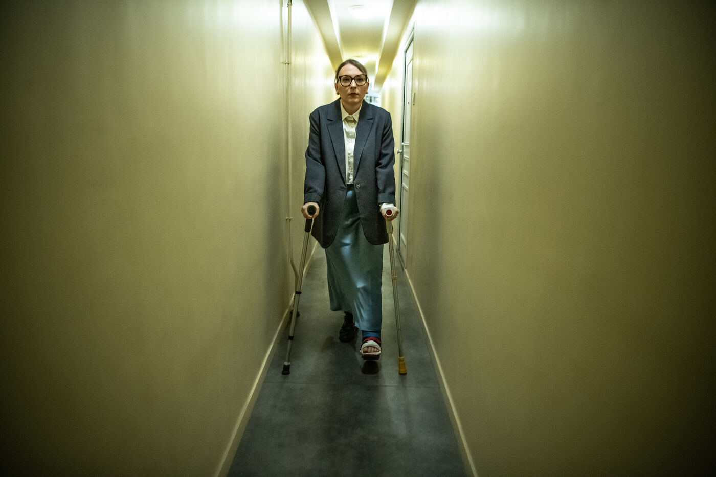 9 janvier 2025 Paris. Angela Grignano victime de l'explosion de la rue de Trévise en 2019. Elle se déplace en chaise ou en bequilles. Elle habite dans un immeuble au 8e étage. L'ascenceur ne va que jusqu'au 7e.