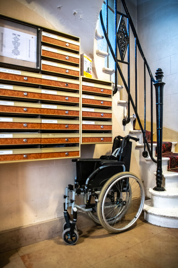 9 January 2025 Paris. Angela Grignano, victim of the Rue de Trévise explosion in 2019. She uses a chair or crutches. She lives in a building on the 8th floor. The lift only goes up to the 7th floor.
