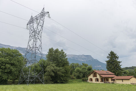 Pylônes de lignes de transport d'électricité à haute tension situés dans une zone rurale du département de l'Ysere.