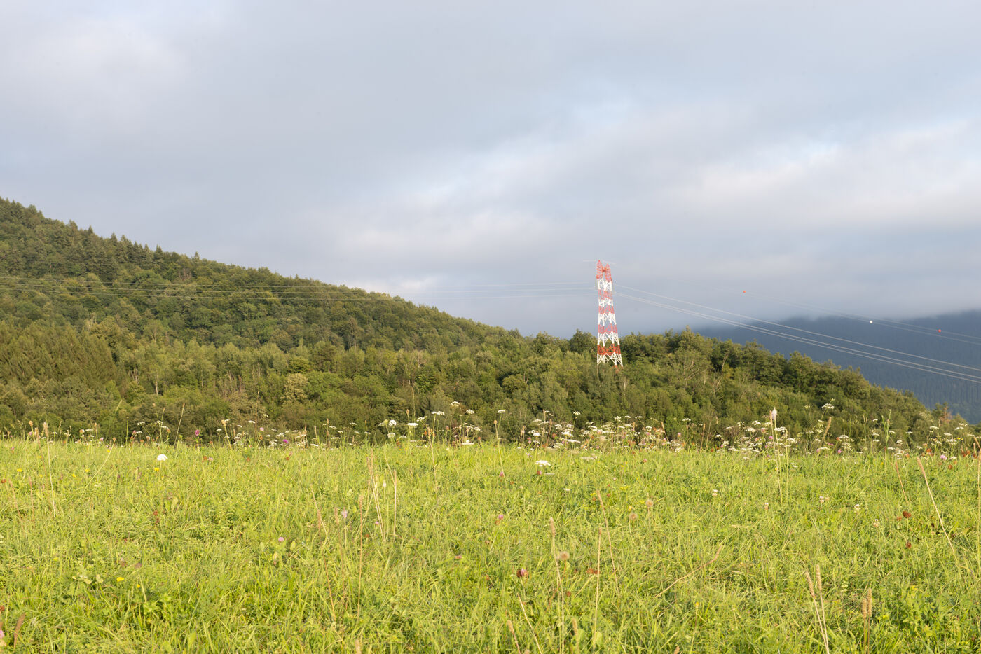 High voltage transmission line towers located in a rural area of the Ysere department.