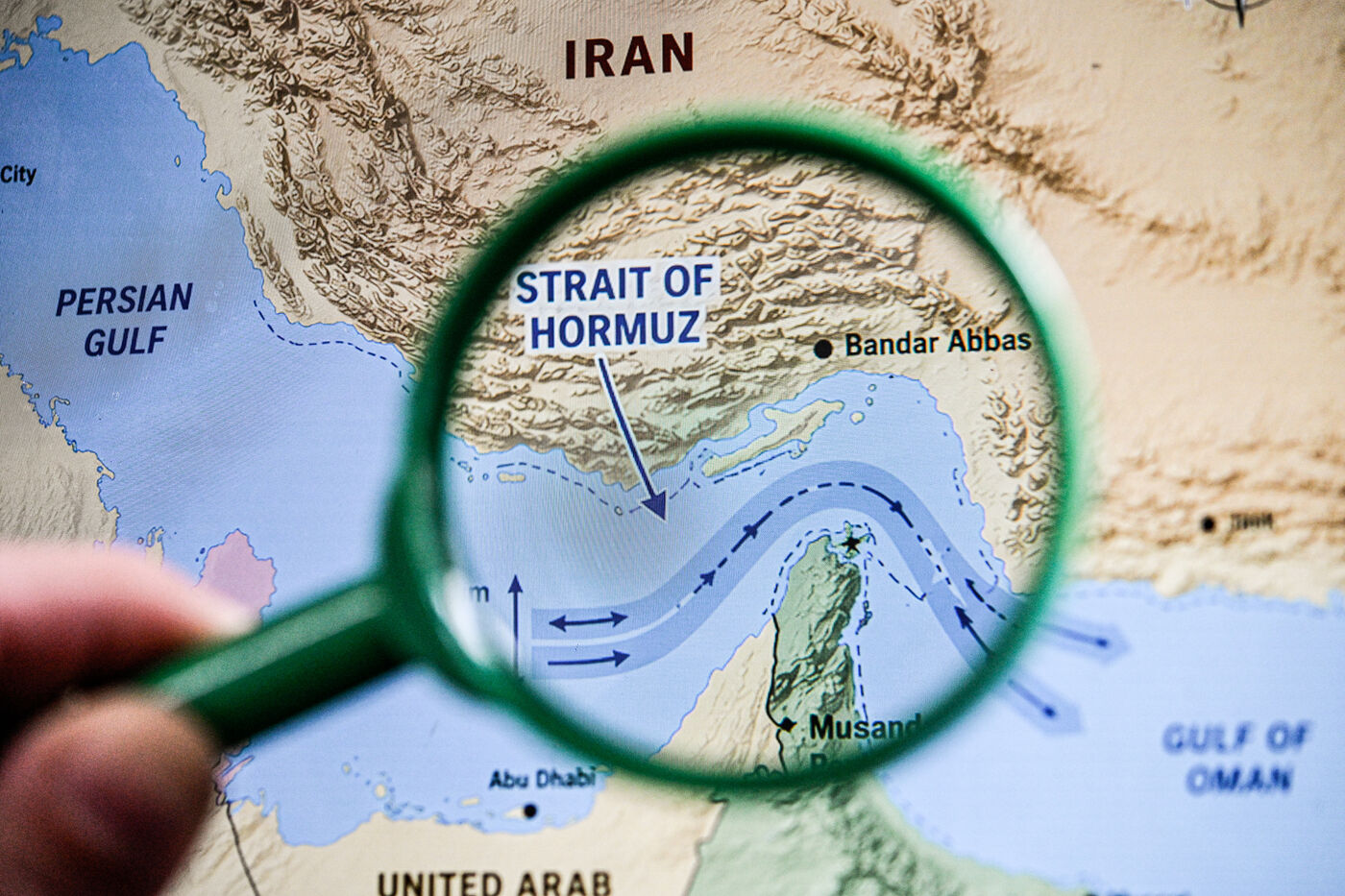 Close-up image of a magnifying glass highlighting the Strait of Hormuz on a map in Paris France on April 15, 2026. The Strait of Hormuz is a narrow maritime passage between Iran and Oman linking the Persian Gulf to the Gulf of Oman through which about one fifth of global oil shipments transit.