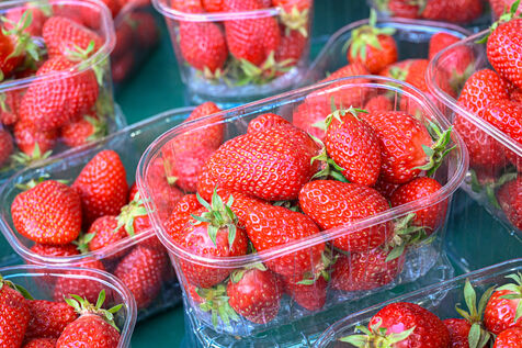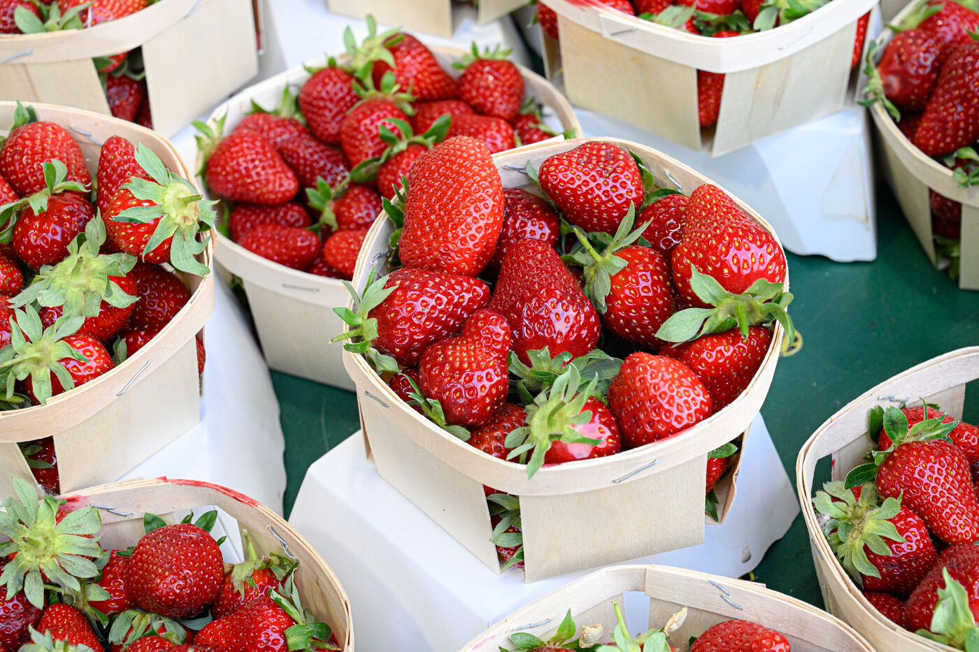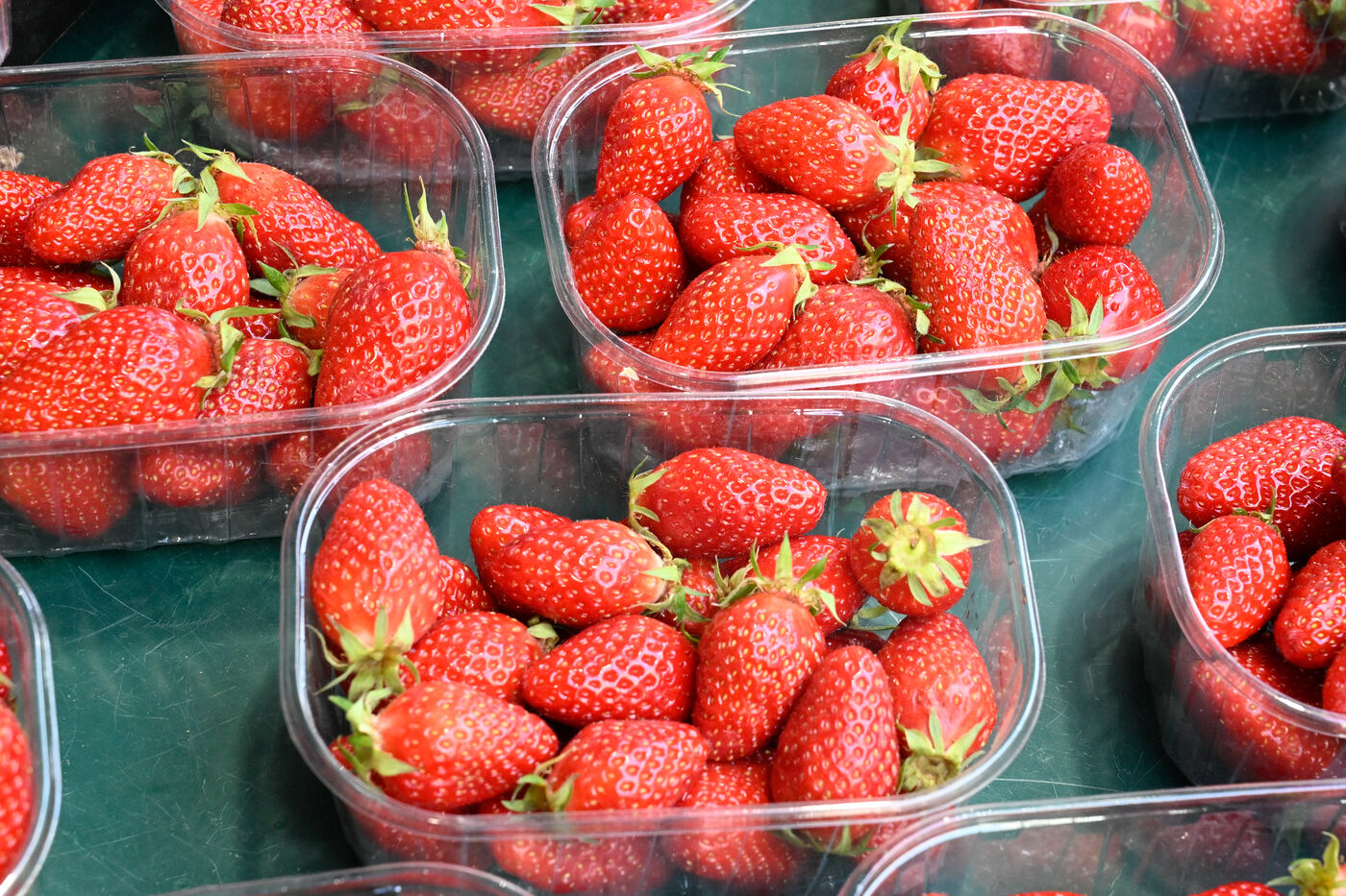 Illustration of French strawberries displayed for sale in plastic containers on a market stall in Paris, France, on April 16, 2026. The high seasonal production leads to abundant supply on local markets.