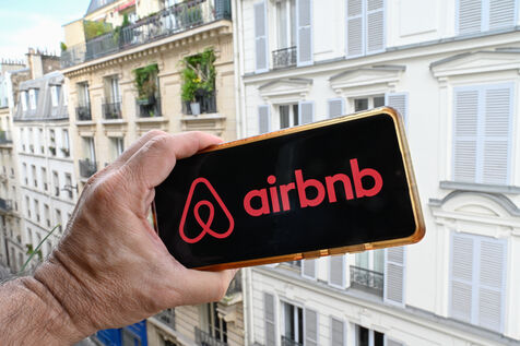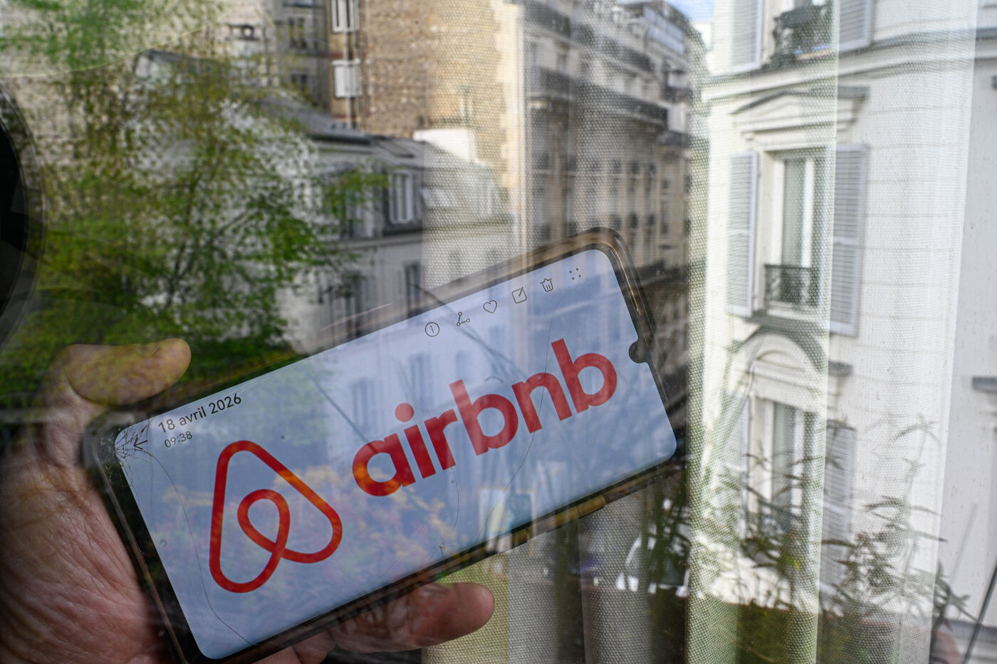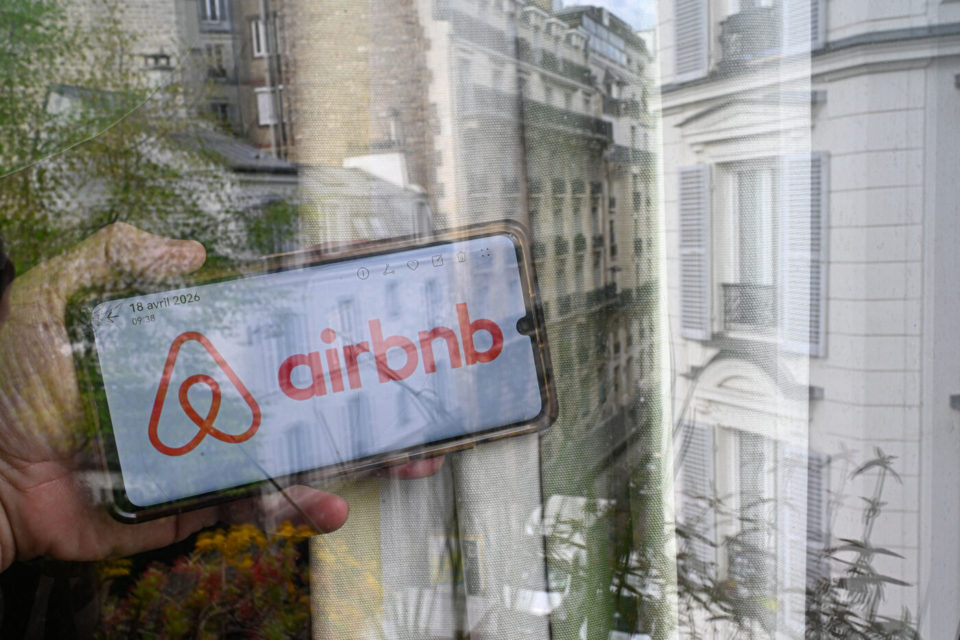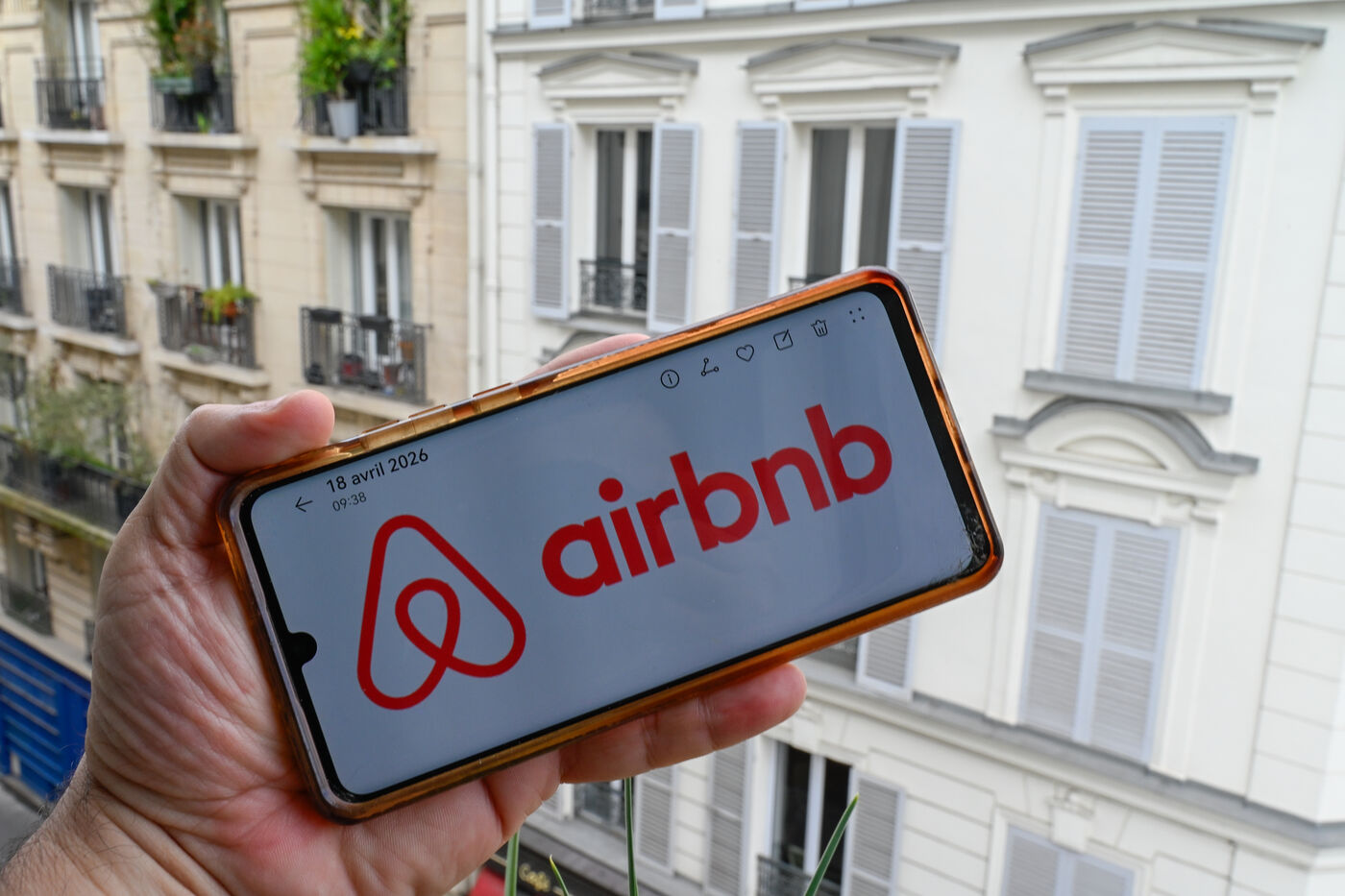 Illustration of the Airbnb logo displayed on a smartphone in front of Parisian residential building and windows on April 18, 2026. A real estate company was fined nearly 600000 euros after illegally converting a former social housing building into eleven short term rental units listed on the platform.