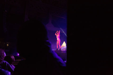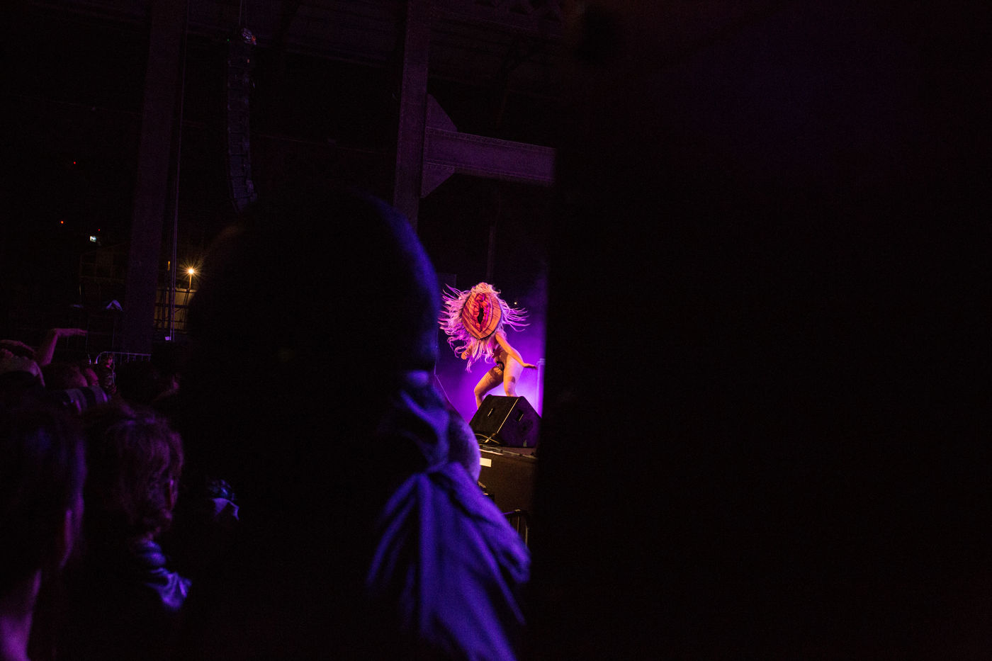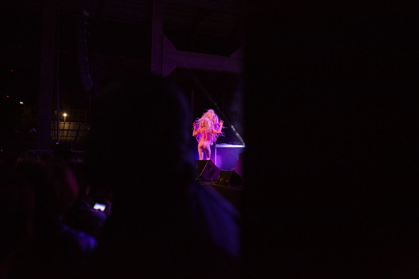 Concert of the canadian punk rock singer Peaches under the naves of Nantes Island during the "Nuit du VAN", the opening night of the "Voyage à Nantes". Nantes, France - July 1st, 2017