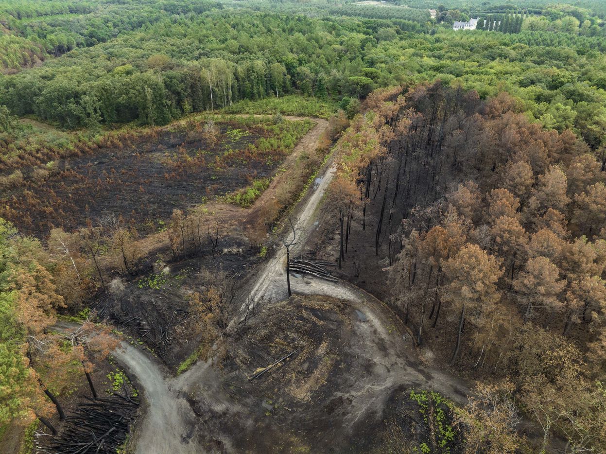 Apres les incendies du mois d aout, 1500 hectares de foret ont brule, il faut s' occuper des arbres. Les couper, les exploiter. Les premieres coupes ont eu lieu. Les billes de bois sont entassees. Des paysages nus apparaissent.