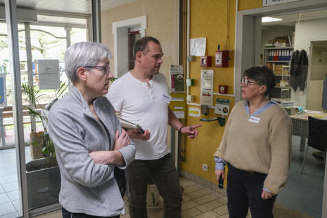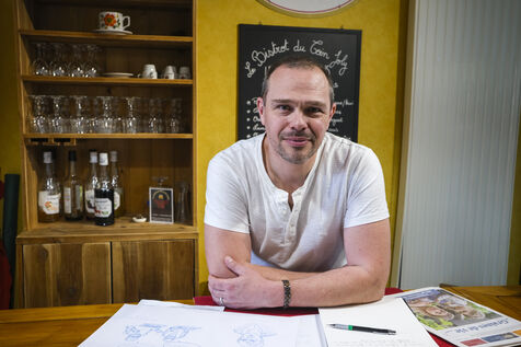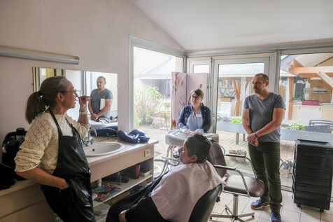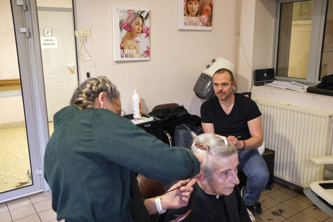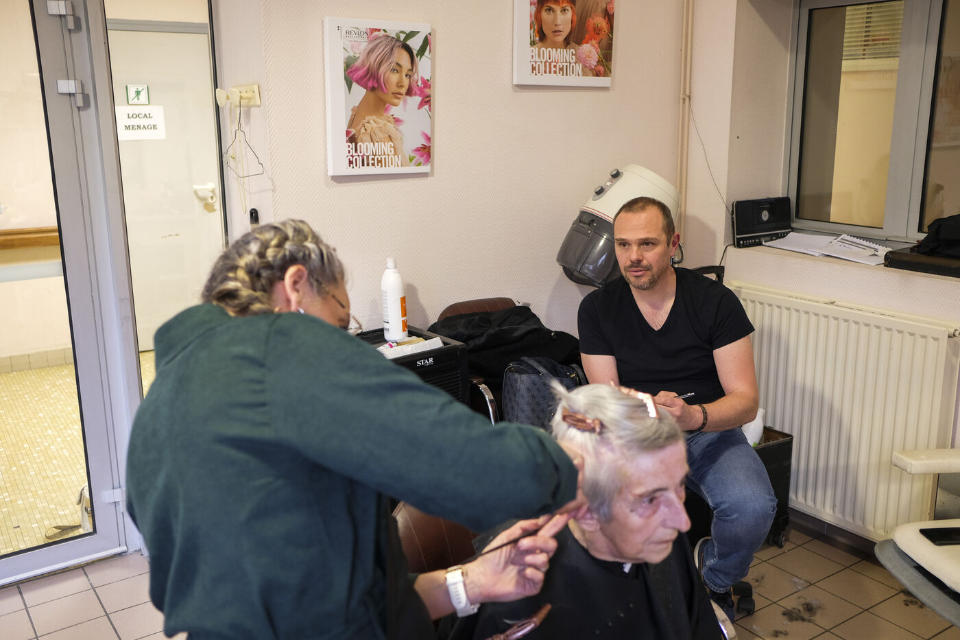 FRANCE, SAINT-MATHURIN SUR LOIRE. 04-07-2024. At the Bourg-Joly nursing home in Maine-et-Loire, the team working with the elderly asked Simon Bonnefoy, a comic strip artist from the Atelier Kawa art studio in Mazé-Milon, to create a comic strip. The idea is to change the way people look at old people's homes. How can we play down old age and change the image of these establishments? Volunteer residents and professionals will talk about what they experience and how they work. Photographer: Jean-Michel Delage/Hans Lucas