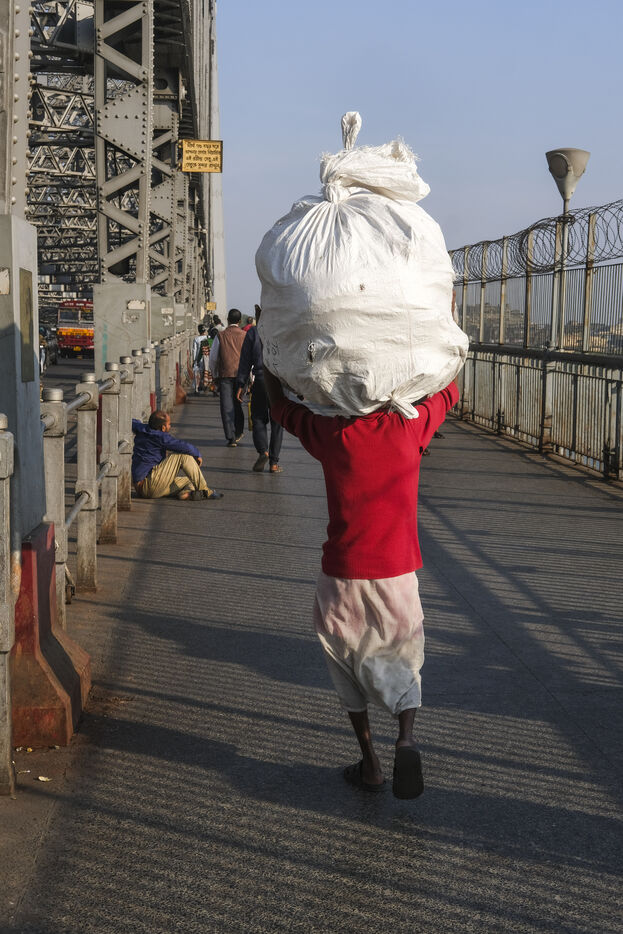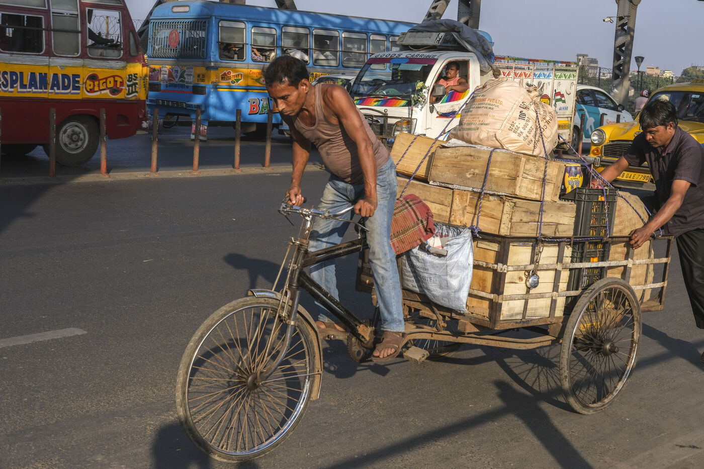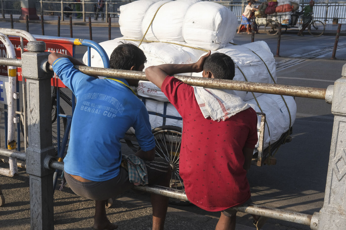 INDE, KOLKATA. 30 décembre 2024. A Calcutta, ville la plus importante de la partie orientale de l’Inde, les hommes venant des campagnes remplacent les camions de marchandises. En effet, ceux que l’on surnomme les hommes chevaux permettent de désengorger le centre de la ville. Moyen très économique pour les marchands, ils sont chargés de transporter des tonnes de marchandises jusqu’à la périphérie, là où les camions prennent le relais. Un travail pénible et dangereux. Mais qui aident des centaines d’hommes à survivre. Photographies: Jean-Michel DELAGE/Hans Lucas
