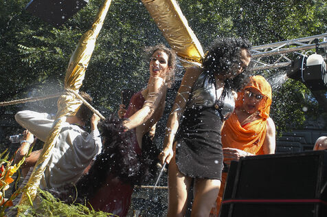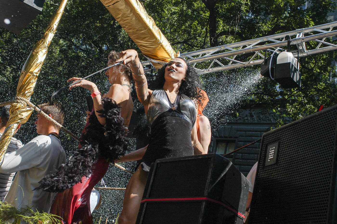 HONGRIE, BUDAPEST. 23 juin 2003. Love parade à Budapest. A cette époque, les hongrois vivaient encore dans une grand liberté post chute du mur. Cette grand parade rassemblait la jeunesse. La communauté LGBT pouvait sortir et les lois anti-homosexualité n’étaient pas d' actualité. Les rue de Budapest respiraient la liberté comme jamais. Photographe: Jean-Michel Delage