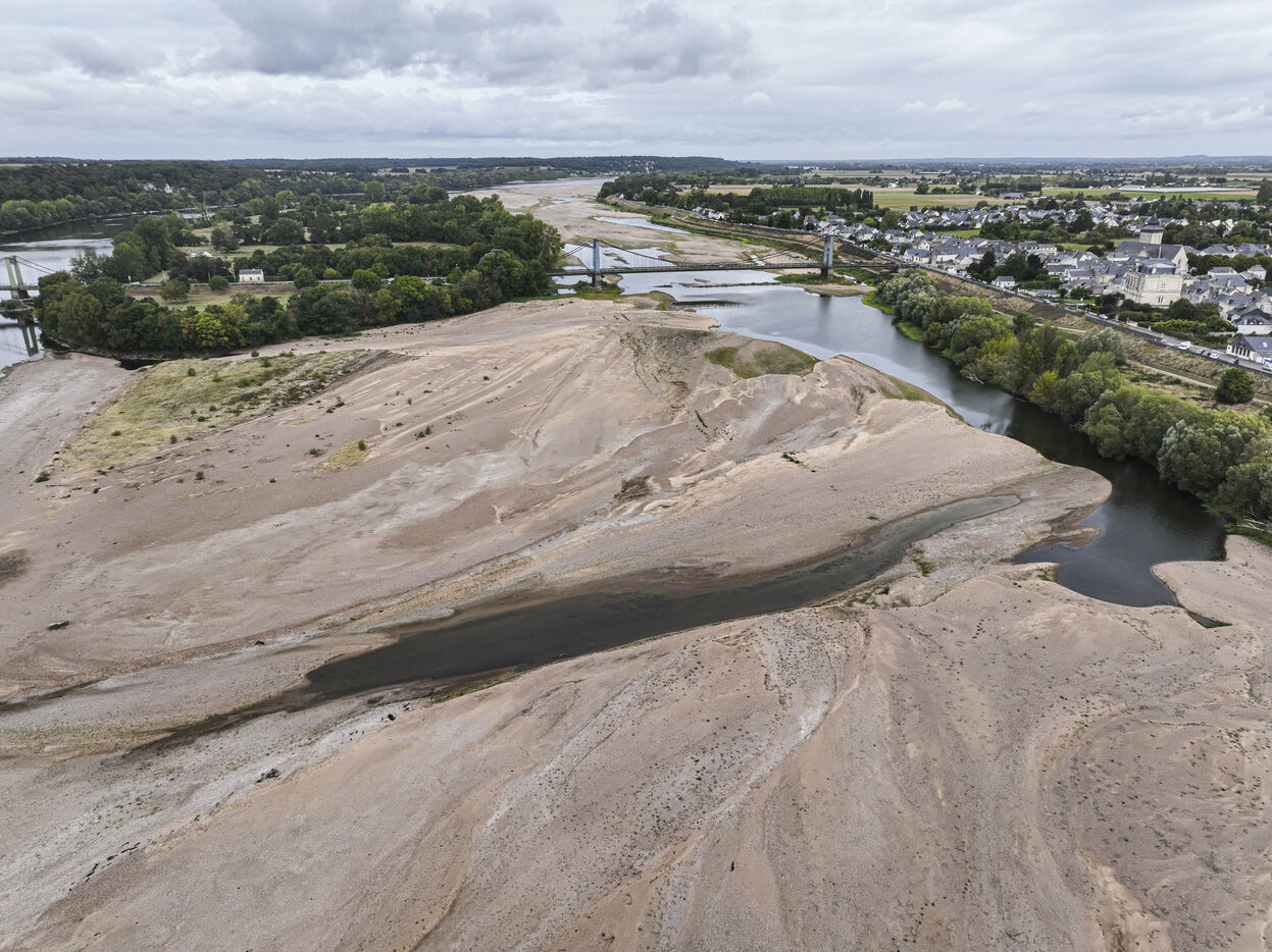 FRANCE, MAINE ET LOIRE. 01 septembre 2025. La Loire dans le Maine et Loire. Certaines portions ne sont plus que des bancs ce sable. Un manque d’eau dû au climat change radicalement la physionomie du fleuve. Photographe: Jean-Michel DELAGE/Hans Lucas