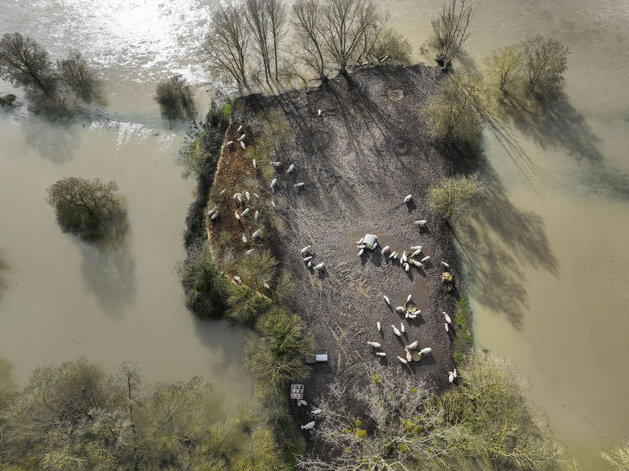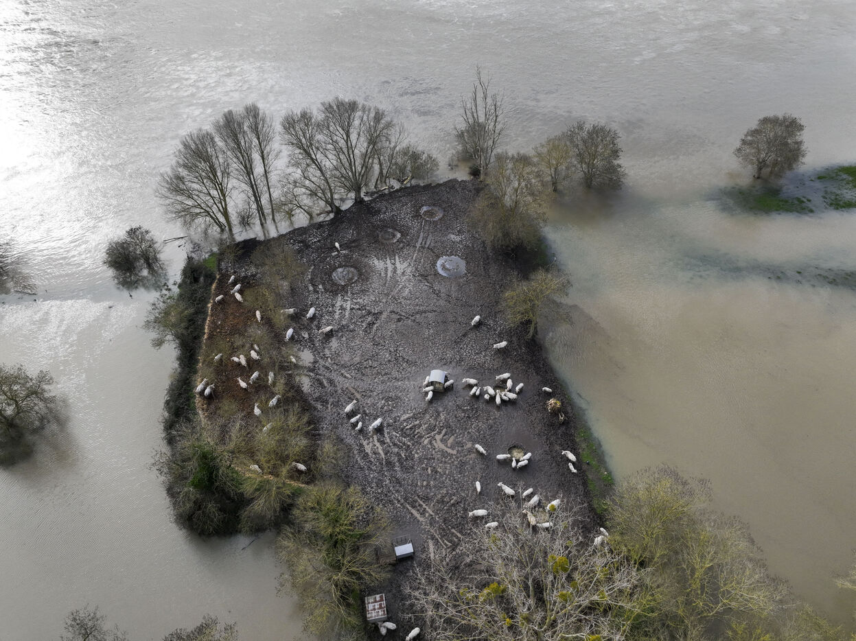 FRANCE, SAINT-MATHURIN SUR LOIRE. 14 février 2026. La Loire continue sa crue. Le fleuve s’est étalé jusqu’à la levée, cette protection sur laquelle est construite la route. Pas de dégâts pour le moment. Mais ce troupeau de vaches est encerclé par les eaux. Photographe Jean-Michel Delage/Hans Lucas