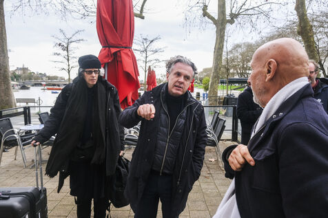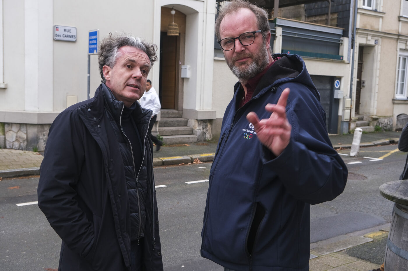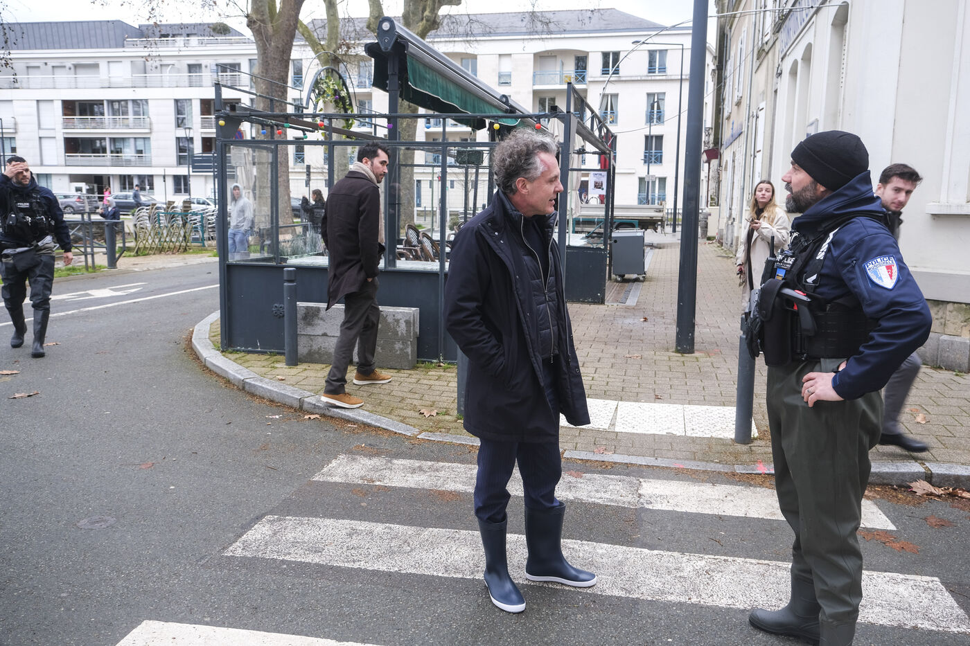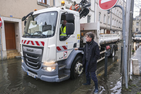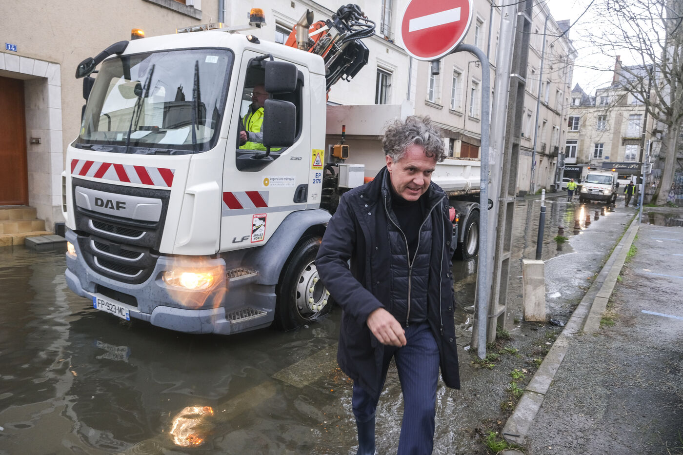 FRANCE, ANGERS. 19 February 2026. The Maine-et-Loire department is on red alert. The Maine River is overflowing. Christophe Bechu, the mayor of Angers, visits the Doutre neighbourhood to meet with residents. Photographer: Jean-Michel DELAGE/Hans Lucas