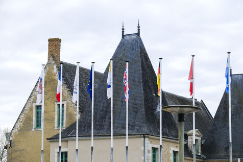 FRANCE, LA FLECHE. 31 mars 2026. Contrairement à plusieurs maires élus sous l’étiquette du Rassemblement national (RN) aux dernières élections, Romain Lemoigne, Maire de La Flèche n’a pas, encore, retiré le drapeau européen de la façade de la mairie. Un geste soutenu par des cadres du parti d’extrême droite et taxé de « populisme » par le gouvernement. Photographe: Jean-Michel Delage/Hans Lucas