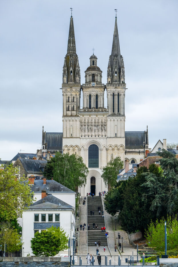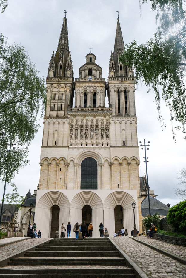 FRANCE, ANGERS. 14th April 2026. Saint-Maurice Cathedral. The new contemporary gallery, a concrete porch attached to the medieval façade and designed to protect the polychrome decoration of the Gothic portal. It is the work of the architect Kengo Kuma. The inauguration took place on 9 April 2026. Photographer: Jean-Michel Delage/Hans Lucas