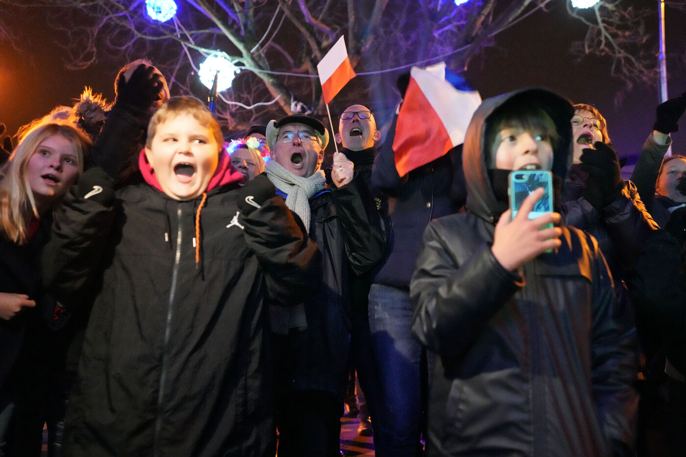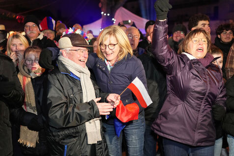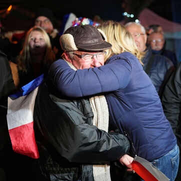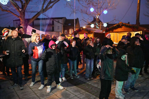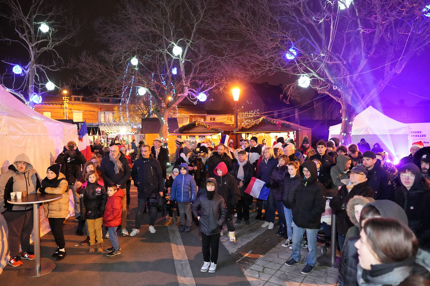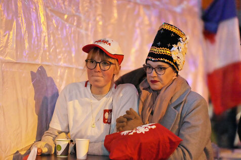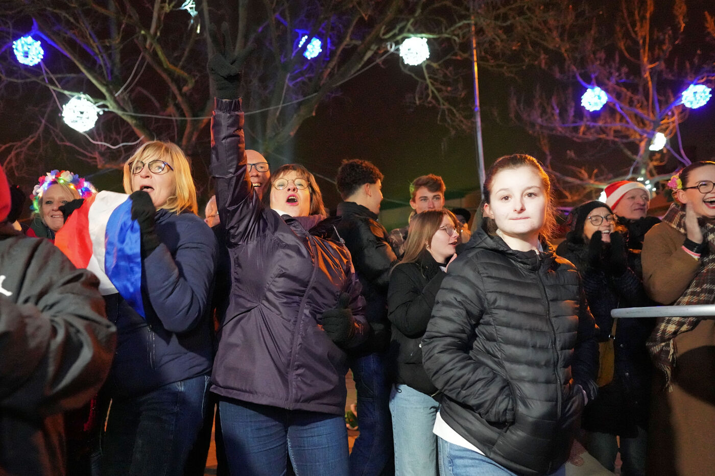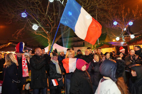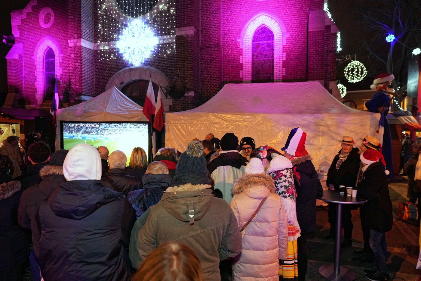Footballs fans watch the live broadcast of FIFA World Cup Qatar 2022 Round of 16 match between France and Poland on a giant screen in the Christmas market on December 04, 2022 in Dourges, Pas-de-Calais, France.