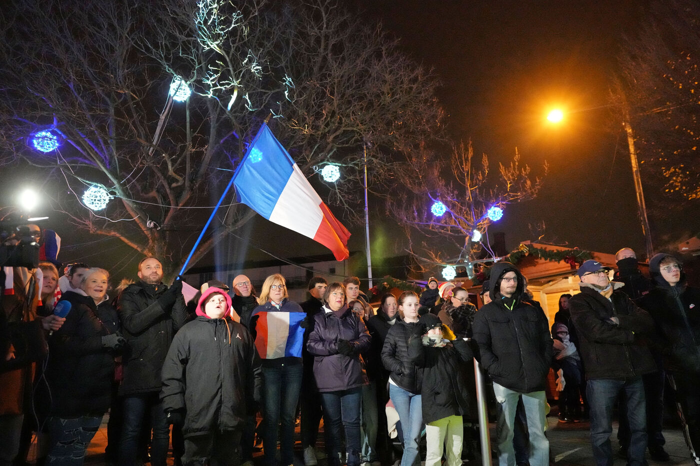 Des fans de football regardent la retransmission en direct du match de huitième de finale de la Coupe du Monde de la FIFA, Qatar 2022 entre la France et la Pologne sur un écran géant au marché de Noël, le 4 décembre 2022 à Dourges, Pas-de-Calais, France.