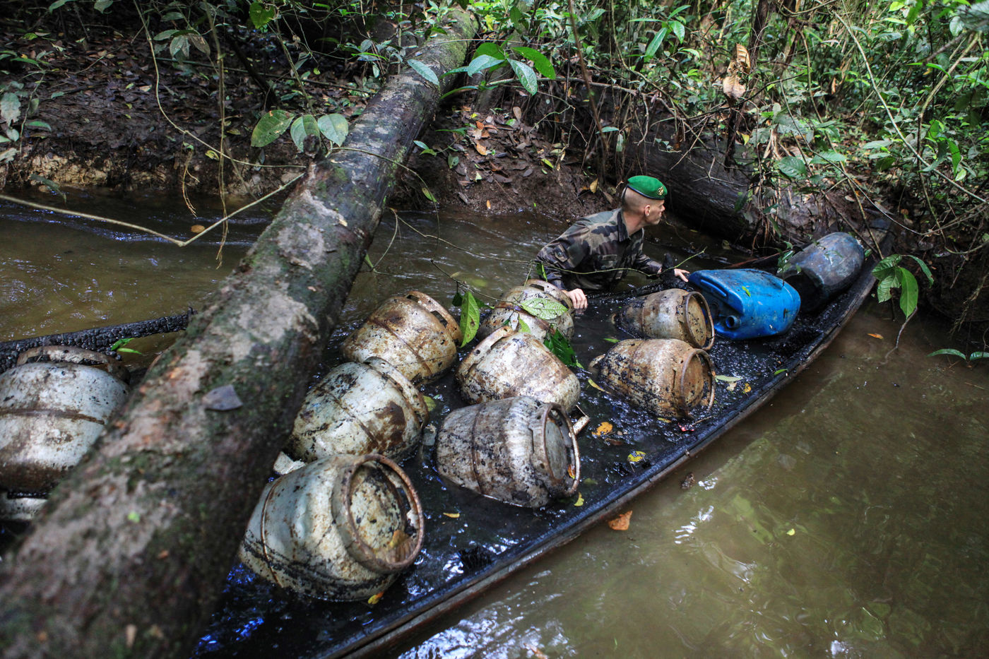 « With 34 € the gram, gold attracts each day of new candidates to putative fortune. » The lieutenant-colonel Lacan of gendarmerie sighs : « between 5000 and 8000 garimpeiros, mainly Brazilian, work illegally in the forest, feeding a gigantic traffic in the middle of the jungle. The gold diggers install true villages of gold washers whom it is necessary to nourish, supply and divert. » In 2010 a hundred sites were dismantled and destroyed of which some had grocer, restaurant, hotel, workshop of mechanics, discotheque and even brothels. « We fight at the same time against the fraudulent exploitation of Guianese gold but also against prostitution networks, sectors of smuggling conveying food and materials, sometimes weapons and narcotics and against the pollution generated by gold washing » Jean-Michel Lacan continues.