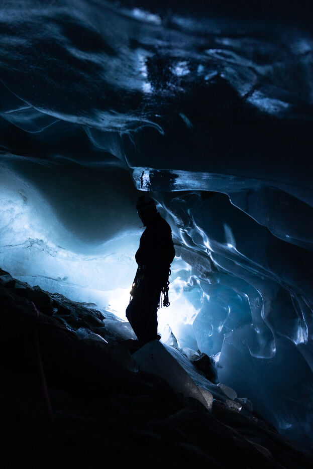 Le 2 novembre 2024, dans le cadre d'une documentation des moulins glaciaires des alpes, nous avons réalisé une descente sous le Glacier de Saint-Sorlin, sous le Pic de l'Etendard dans le massif des Grandes Rousses. Après une descente en rappel dans plusieurs gouffres de glace, nous sommes parvenus au socle glaciaire, entre roche et glace, l'eau a sculpté ce paysage souterrain.