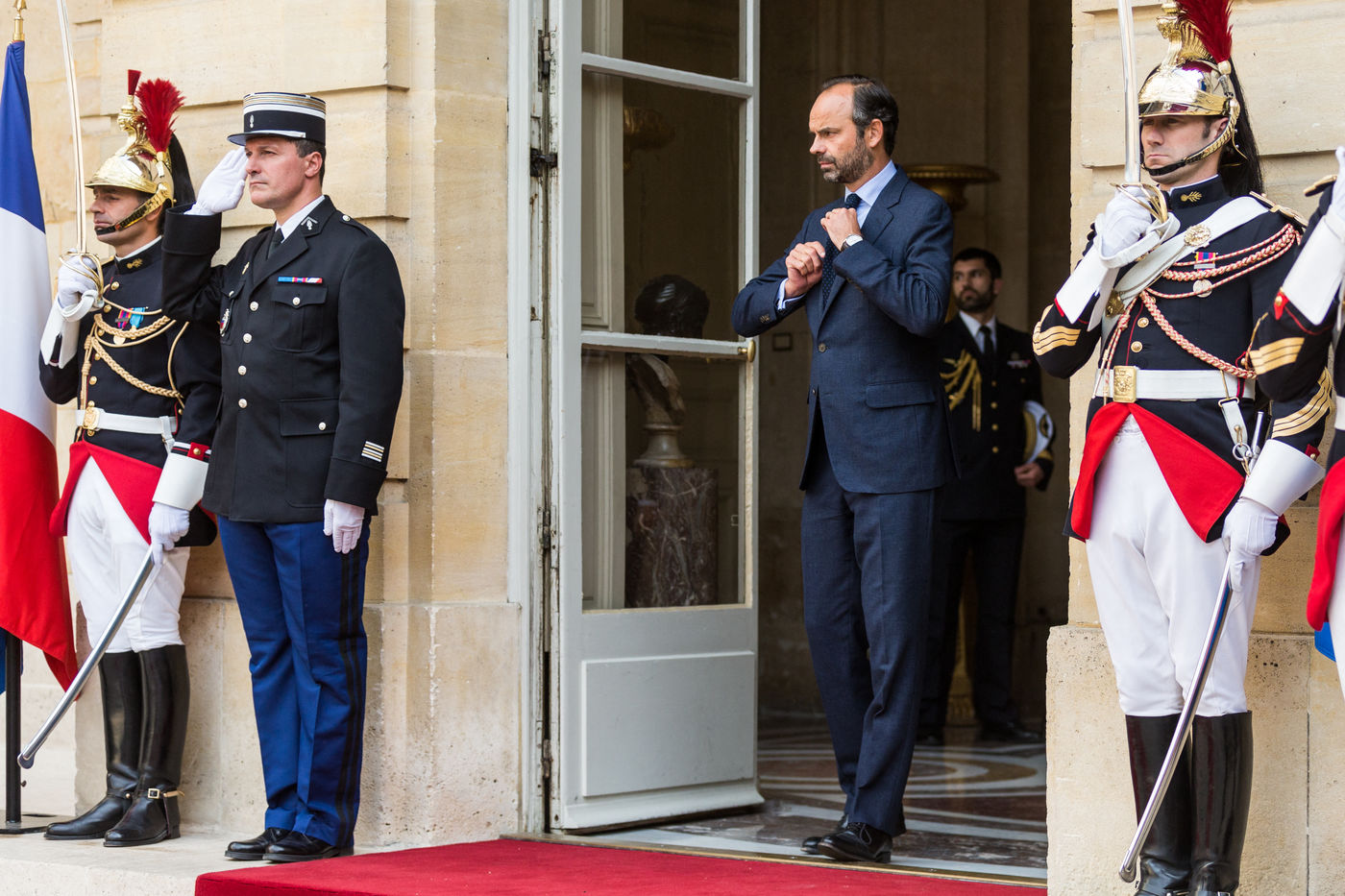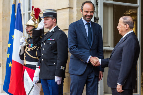 Dans le cadre d'une visite d'État de trois jours en France, le Président libanais Michel Aoun a rencontré le Premier ministre français Edouard Philippe, à Paris, à l'Hotel de Matignon, le 26 septembre 2017.