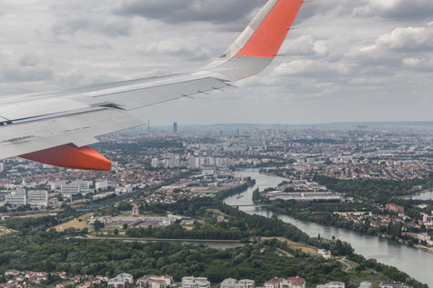 Vues depuis un hublot d'un avion de la compagnie EasyJet qui arrive à l'aéroport d'Orly, près de Paris, en France, le 11 juillet 2017.
