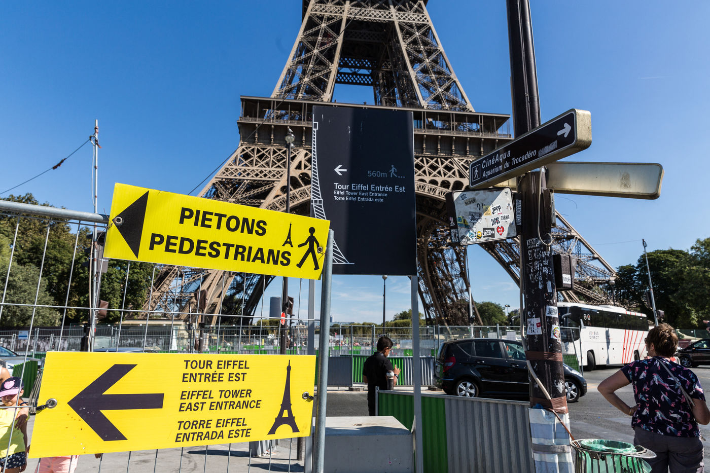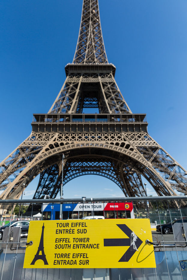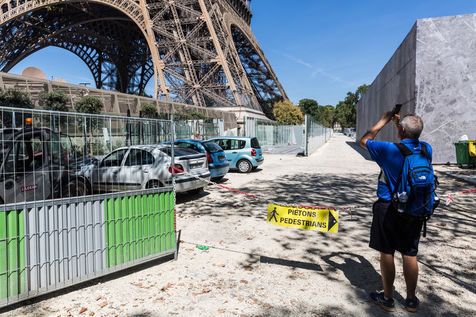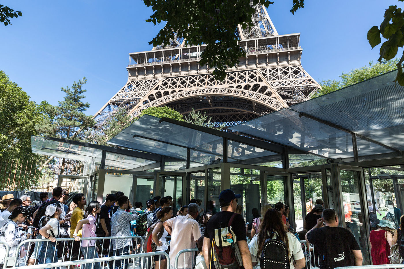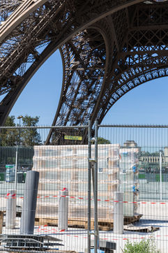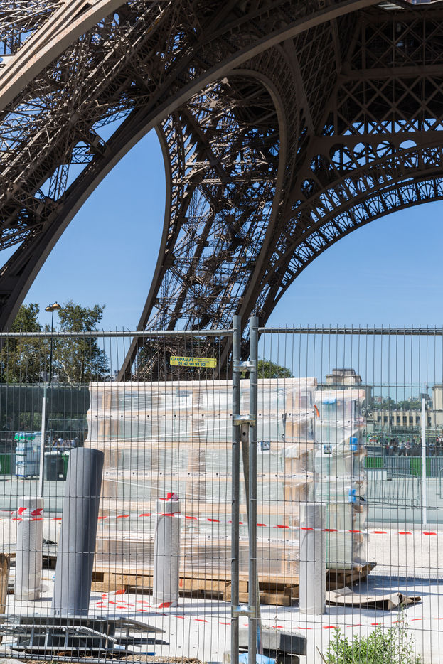 Le chantier du mur de verre de la Tour Eiffel, qui devra la protéger, d'éventuelles attaques terroristes, entraîne une gêne momentannée pour ses visiteurs, à Paris, France, le 5 Août 2018.