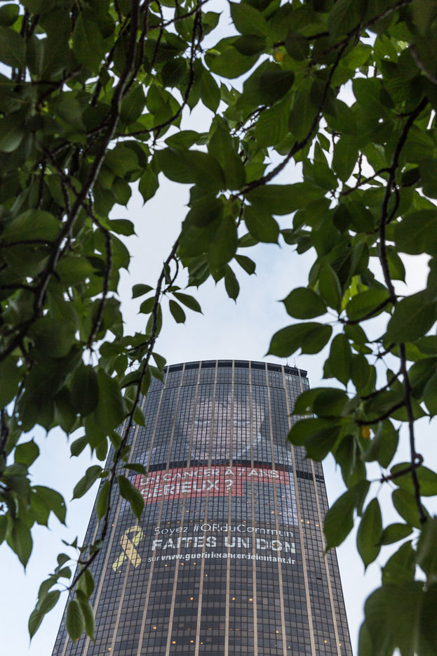 La photographie géante de Noé Lemos, un enfant emporté par un cancer à l'âge de 10 ans, le 24 Septembre 2014, est visible sur une façade de la Tour Monparnasse, à Paris, en France, tout au long du mois de Septembre 2018. Le slogan "Un cancer à 7 ans, sérieux ?" fait partie de la campagne "Guérir le cancer de l'enfant au 21e siècle", lancée par la Fondation Gustave Roussy pour sensibiliser le public aux cancers pédiatriques et lever dix millions d'euros d'ici à 2020.