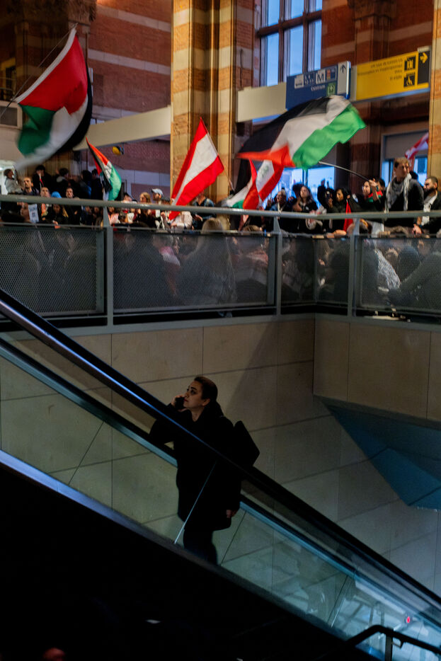 Demonstrators gathered at Amsterdam's Central Station for a peaceful sit-in, marking the one-year anniversary of the renewed conflict between Hamas and Israel. The demonstrators called for an end to the violence in Gaza and showed their solidarity with the Palestinian cause, waving flags and placards calling for peace and justice.