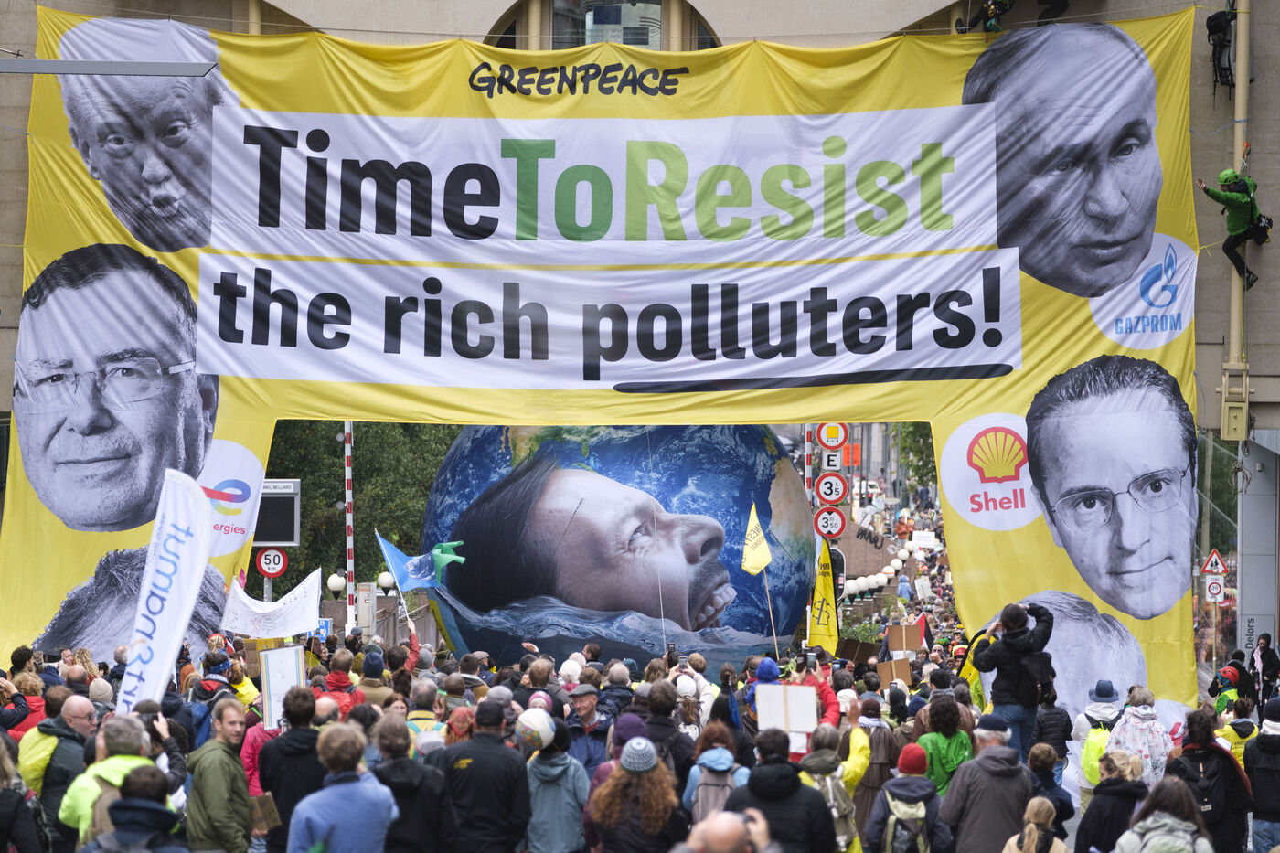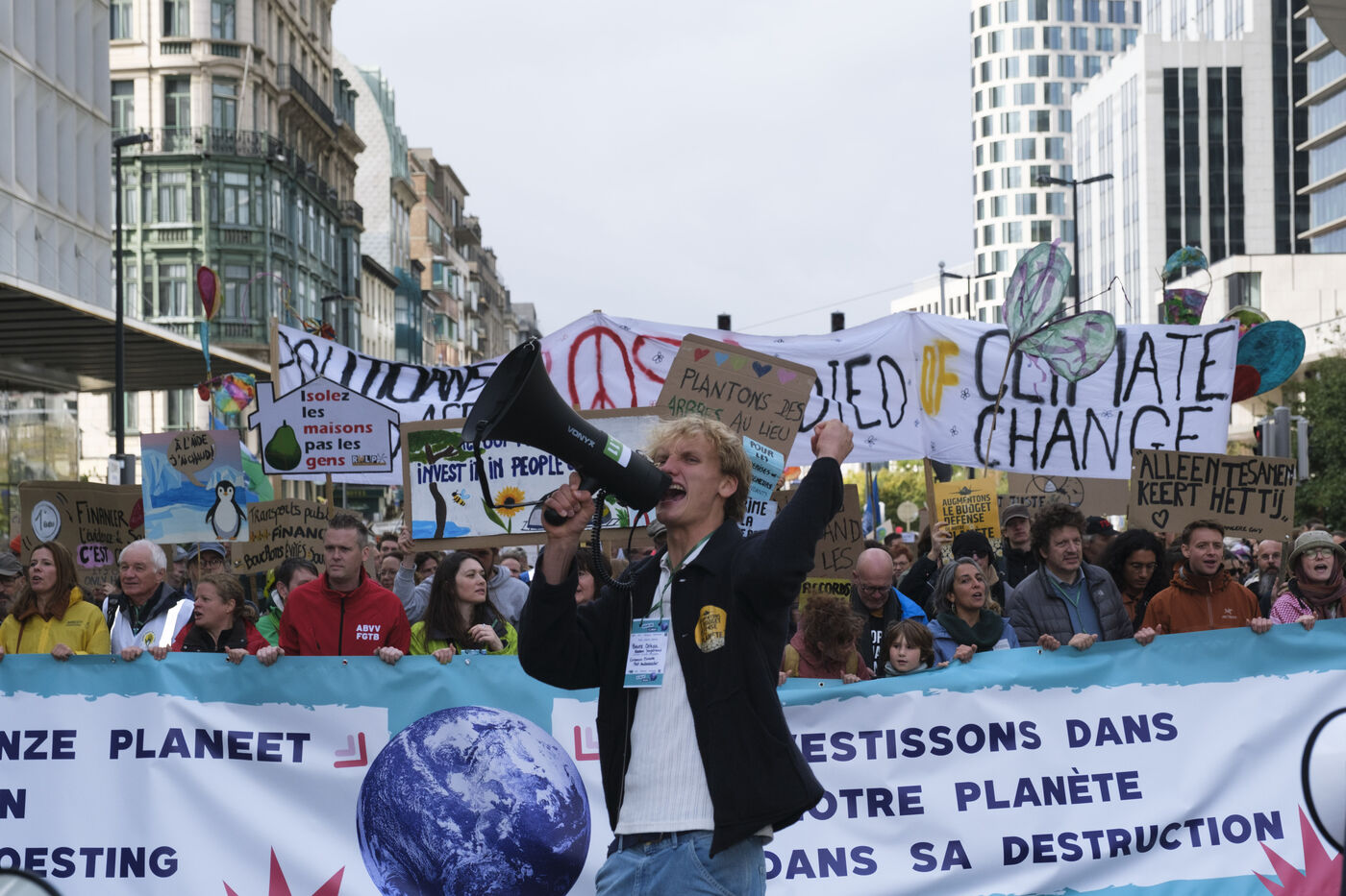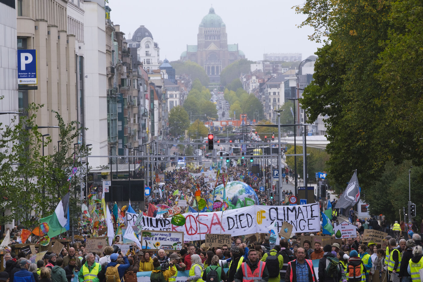 Thousands of people march for the climate in Brussels on October 5, 2025, protesting government measures taken against climate change and for environmental conservation.
