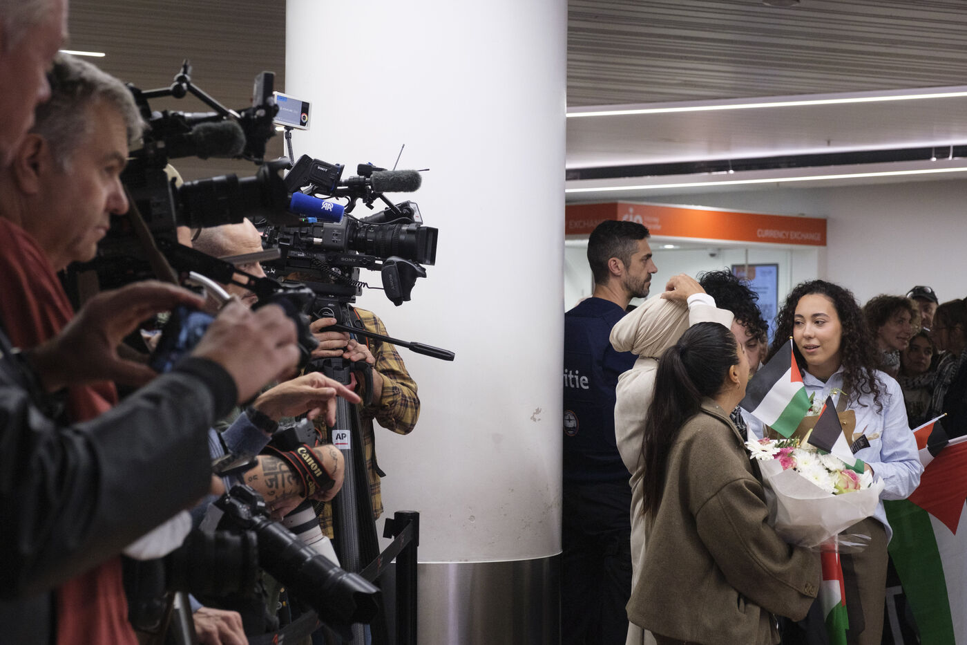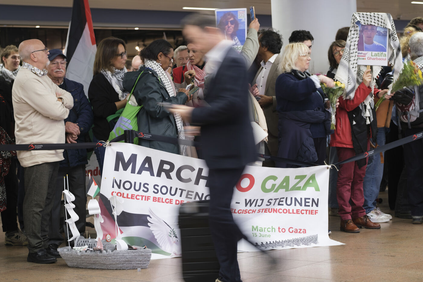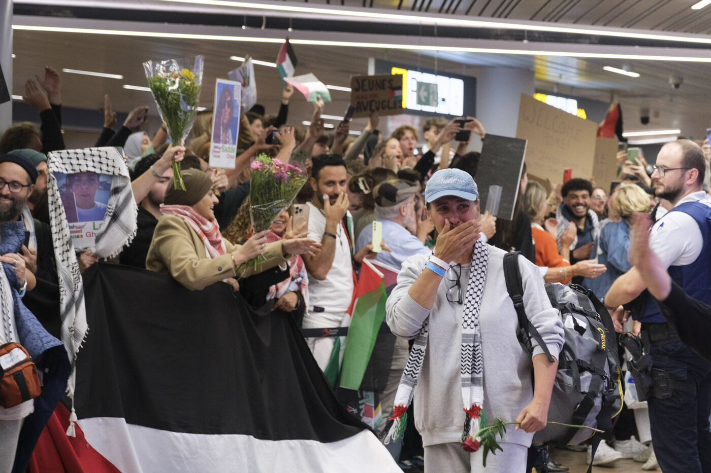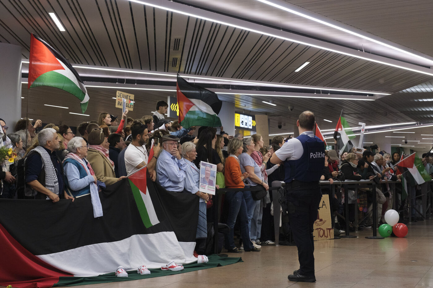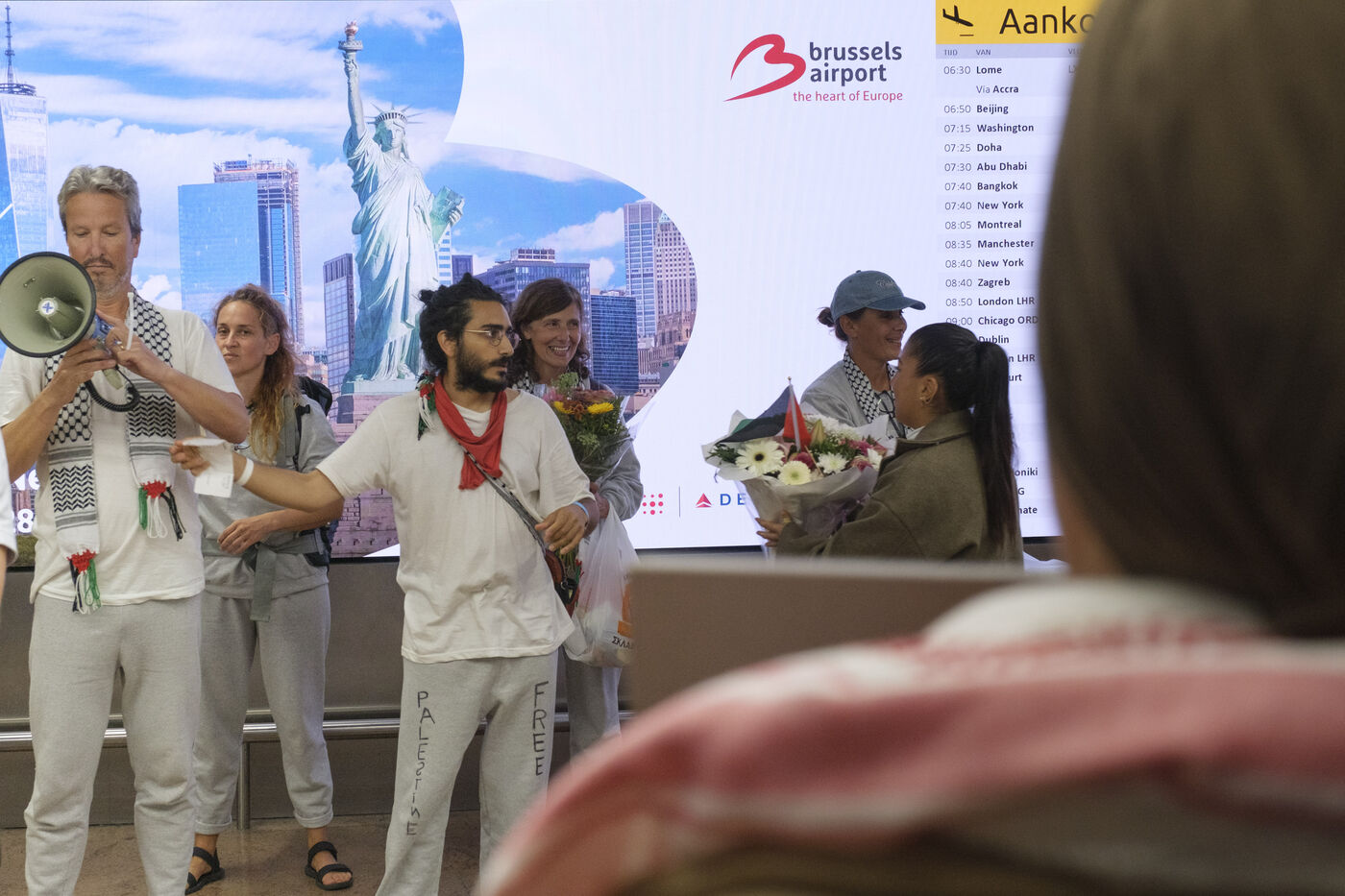 Arrival at Brussels Zaventem Airport of Belgian activists repatriated from Israel after participating in the Global Sumud Flotilla, which was intercepted by the Israeli army before reaching the Gaza Strip, where the flotilla had intended to deliver humanitarian aid and break the Israeli blockade restricting food and medical supplies from reaching the Palestinian population.
