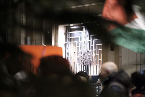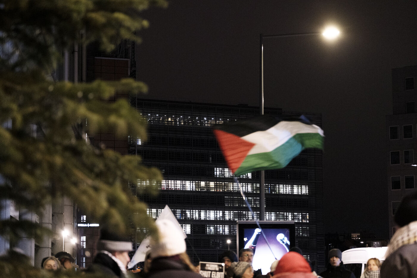 Pro-Palestine demonstration in front of the British Embassy in support of the Palestine Action group hunger strikers known as the Filton 24, imprisoned in England under the Terrorism Act. Brussels, Belgium. December 23, 2025.