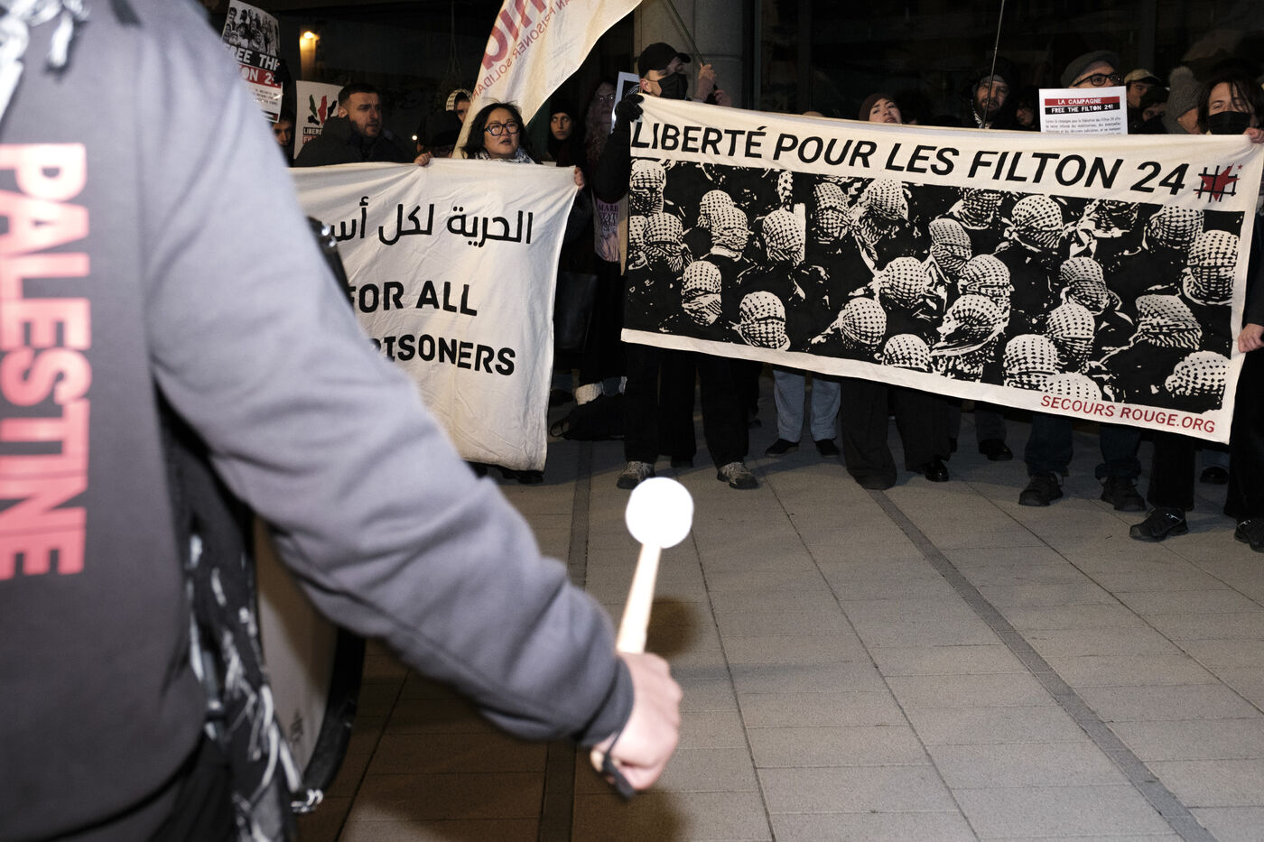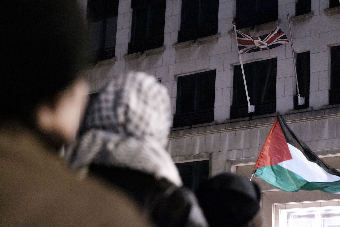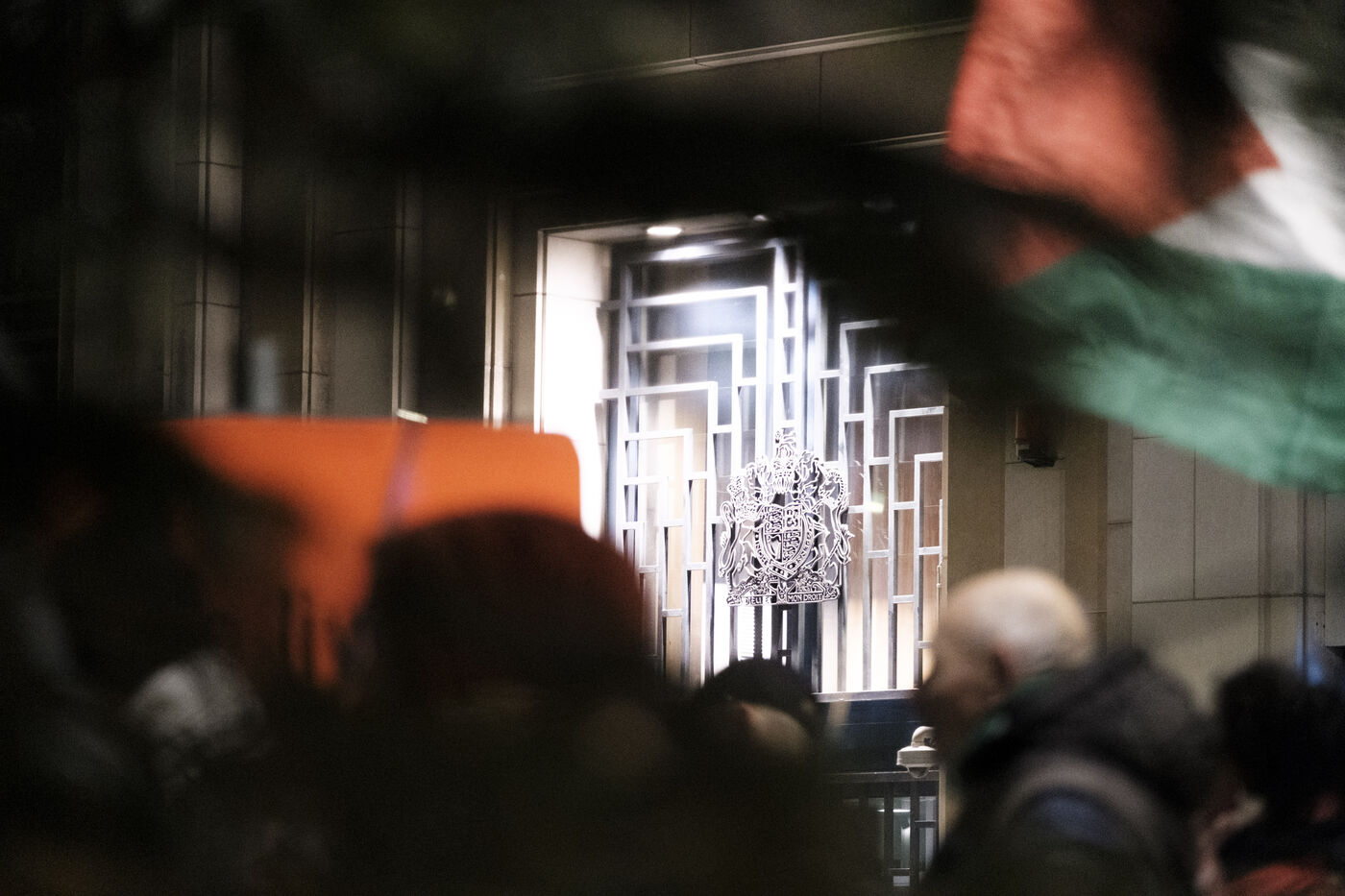 Manifestation pro-Palestine devant l'ambassade du Royaume Uni en soutien aux grévistes de la faim du groupe Palestine Action connus sous le nom de Filton 24, et emprisonnés en Angleterre sous le Terrorism Act. Bruxelles, Belgique. 23 Décembre 2025.