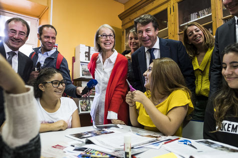 Movement of Françoise Nyssen, Minister of Culture, accompanied by the Mayor of Nice Christian Estrosi, in the former Mistral College in Arles. Discovery of three practical workshops on how to read the image.