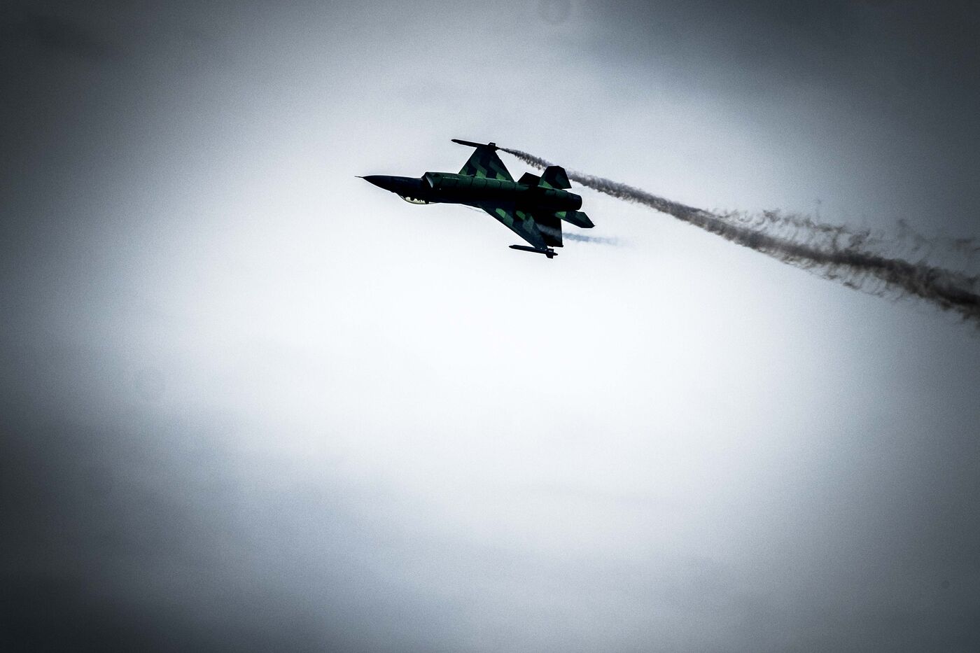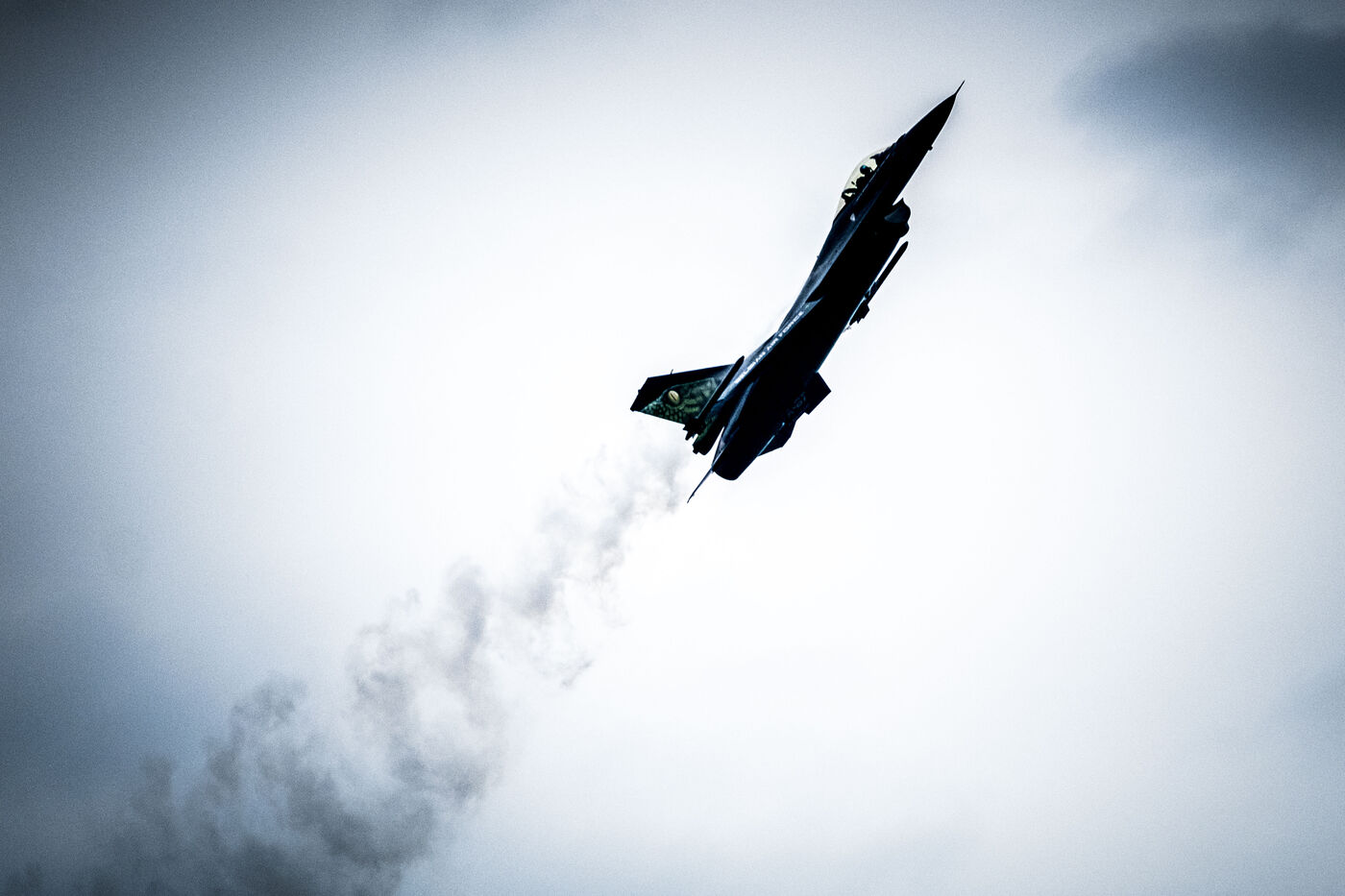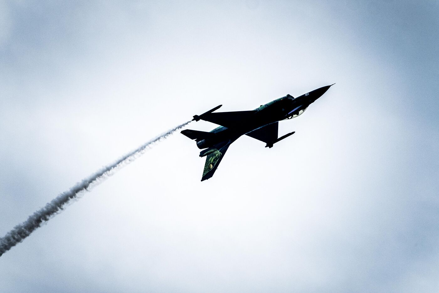 Aerial demonstration of the Belgian F-16 Viper Fighting Falcon (F/A-16) multirole fighter jet at the Salon-de-Provence air show on May 20, 2023.