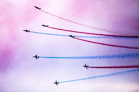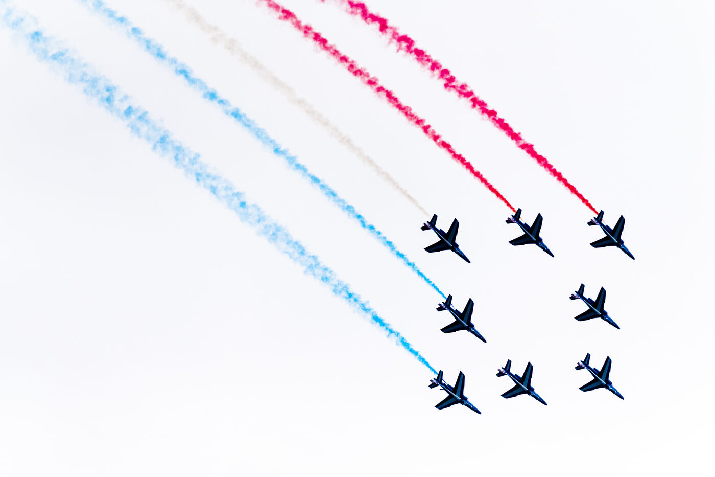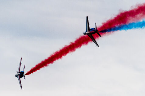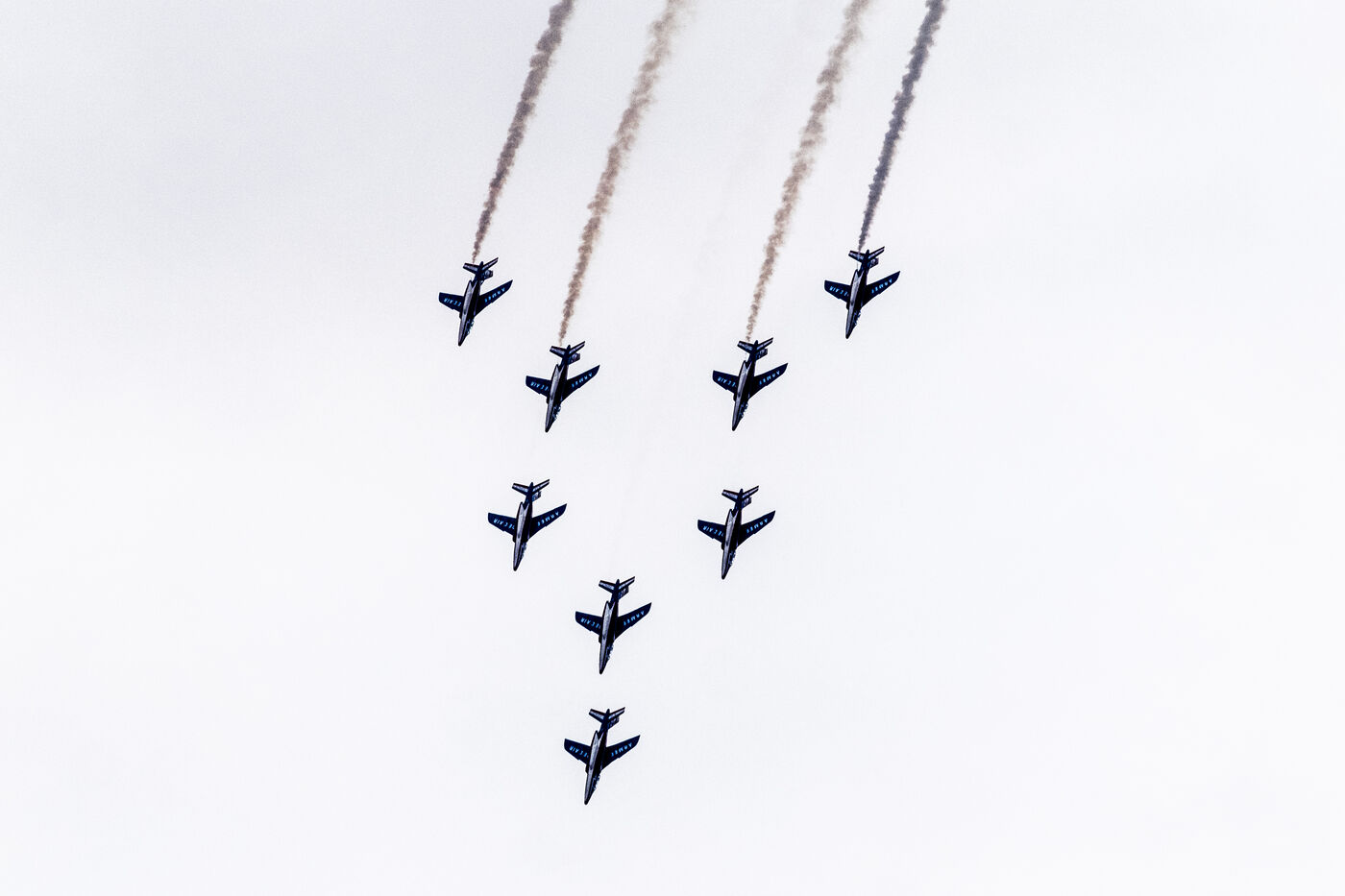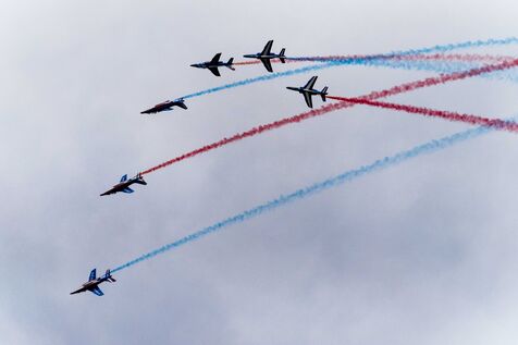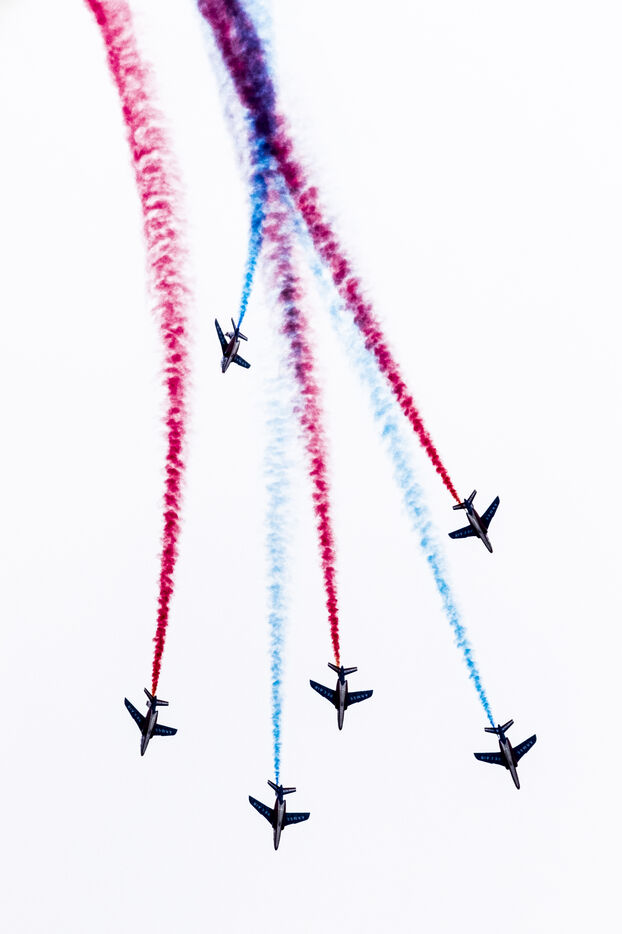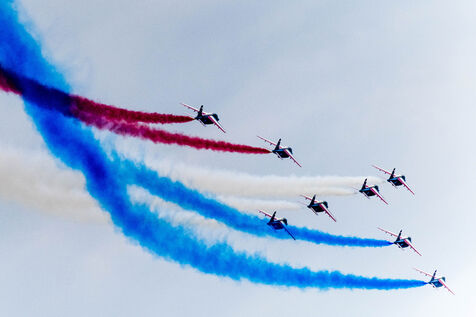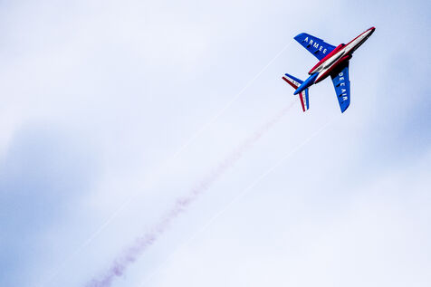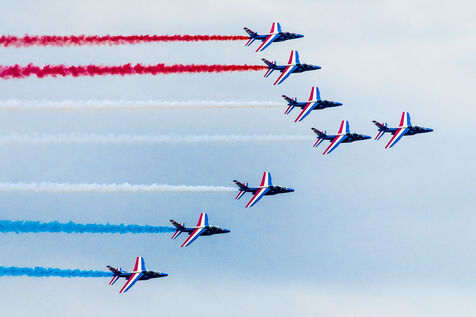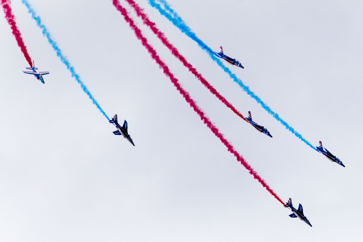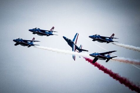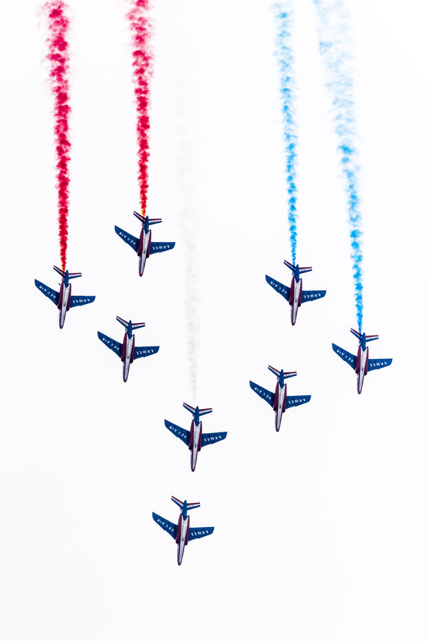 Aerial demonstration by the Patrouille de France accompanied by a Airbus A400M. BA 701 in Salon de Provence hosted a large-scale aeronautical event. Held to mark the 70th anniversary of the Patrouille de France, the National Air Show was organized to benefit the Fondation des Œuvres Sociales de l'Air. May 20 and 21, 2023. France
