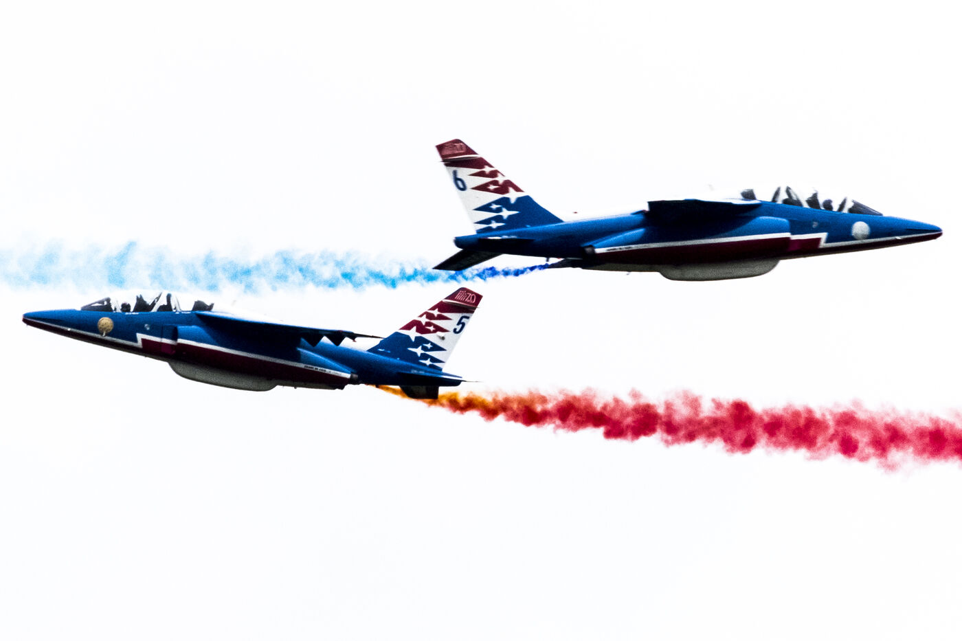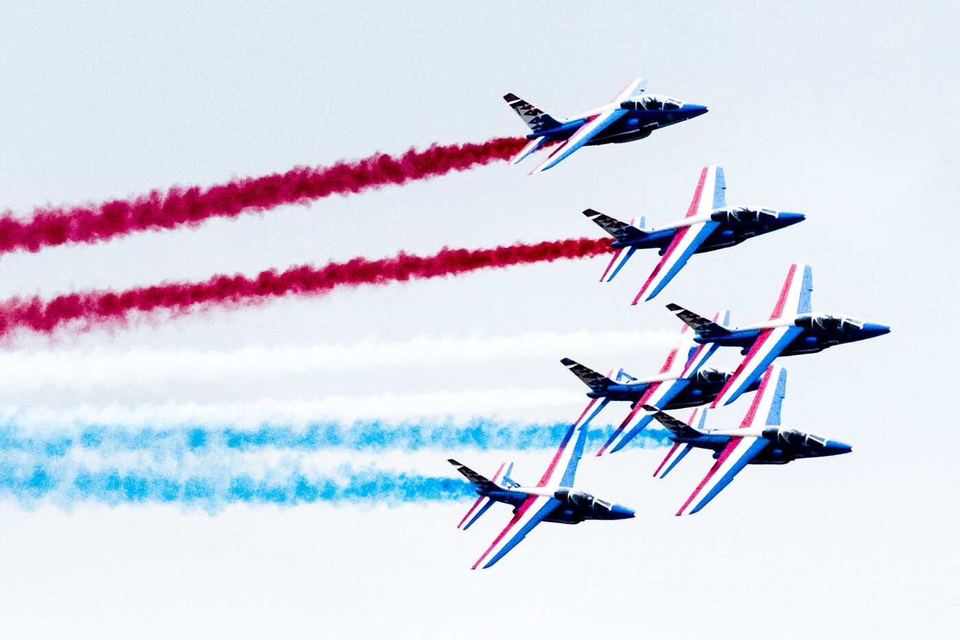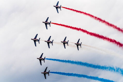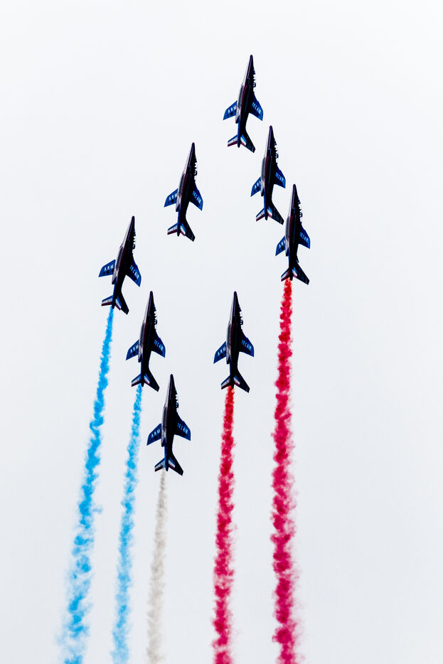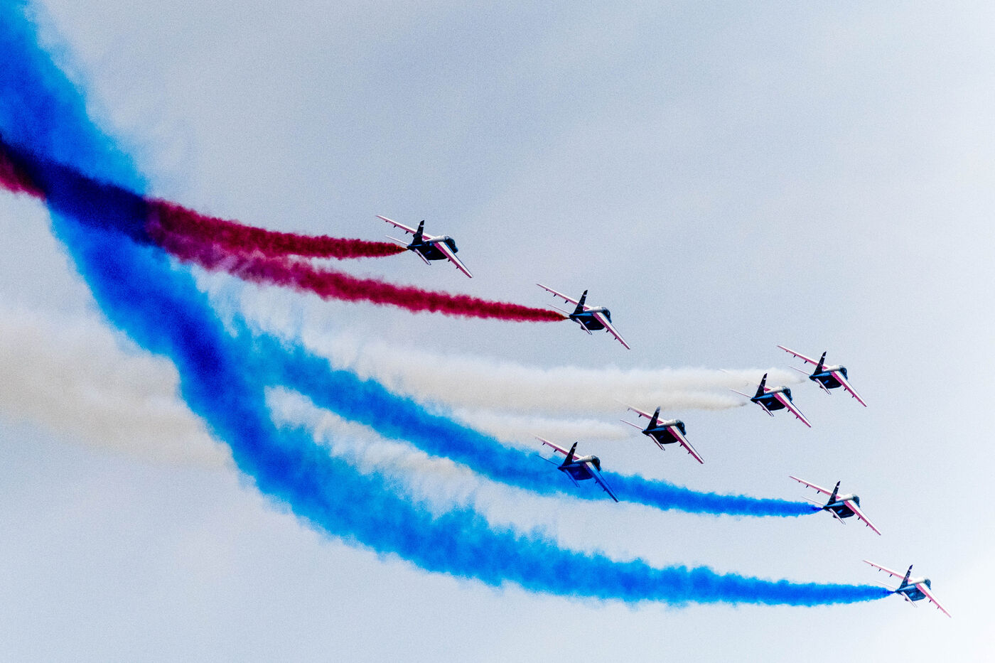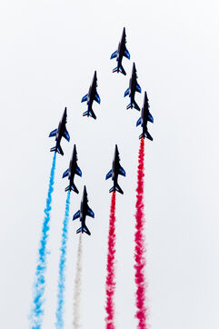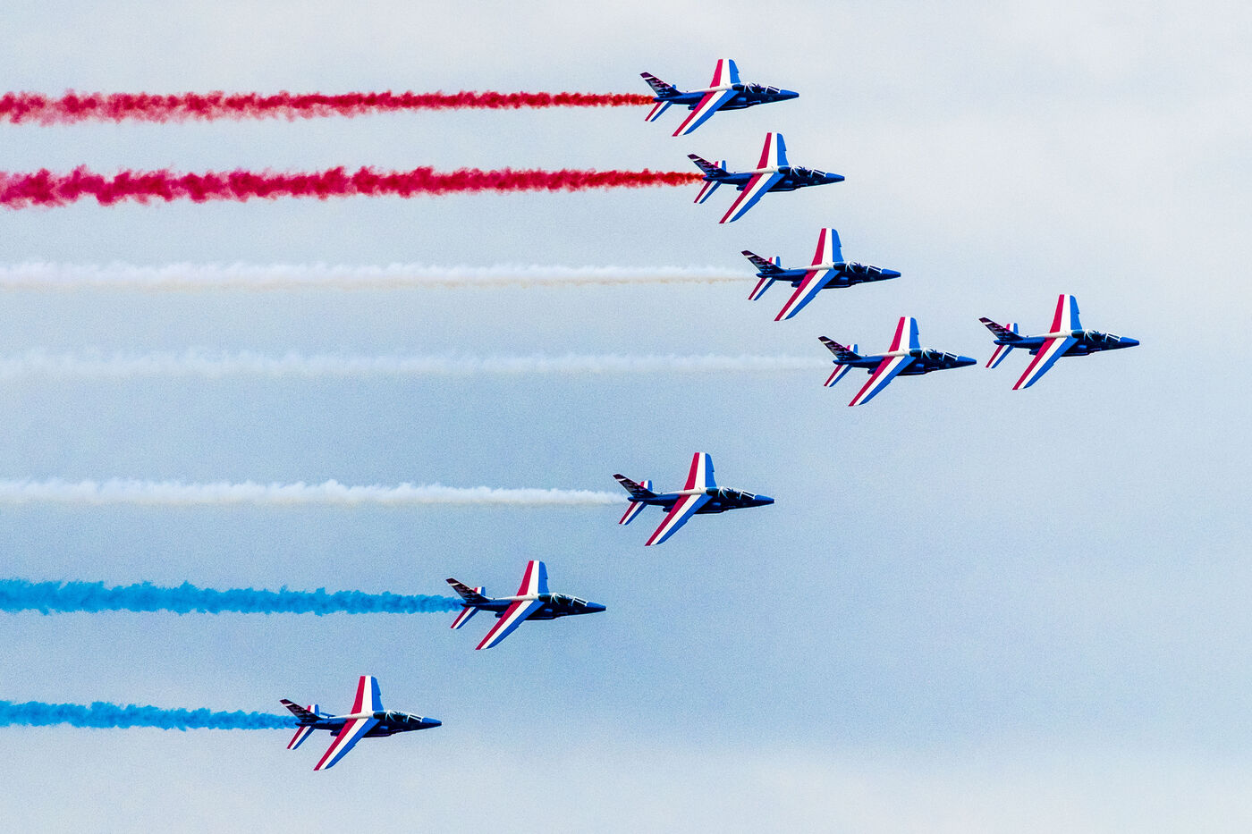 Démonstration aérienne de la Patrouille de France accompagnée d'un Airbus A400M. La BA 701 de Salon de Provence accueillait un événement aéronautique de grande ampleur. Réalisé à l'occasion des 70 ans de la patrouille de France, le meeting national de l'Air était organisé au profit de la Fondation des Œuvres Sociales de l'Air. 20 Et 21 mai 2023. France