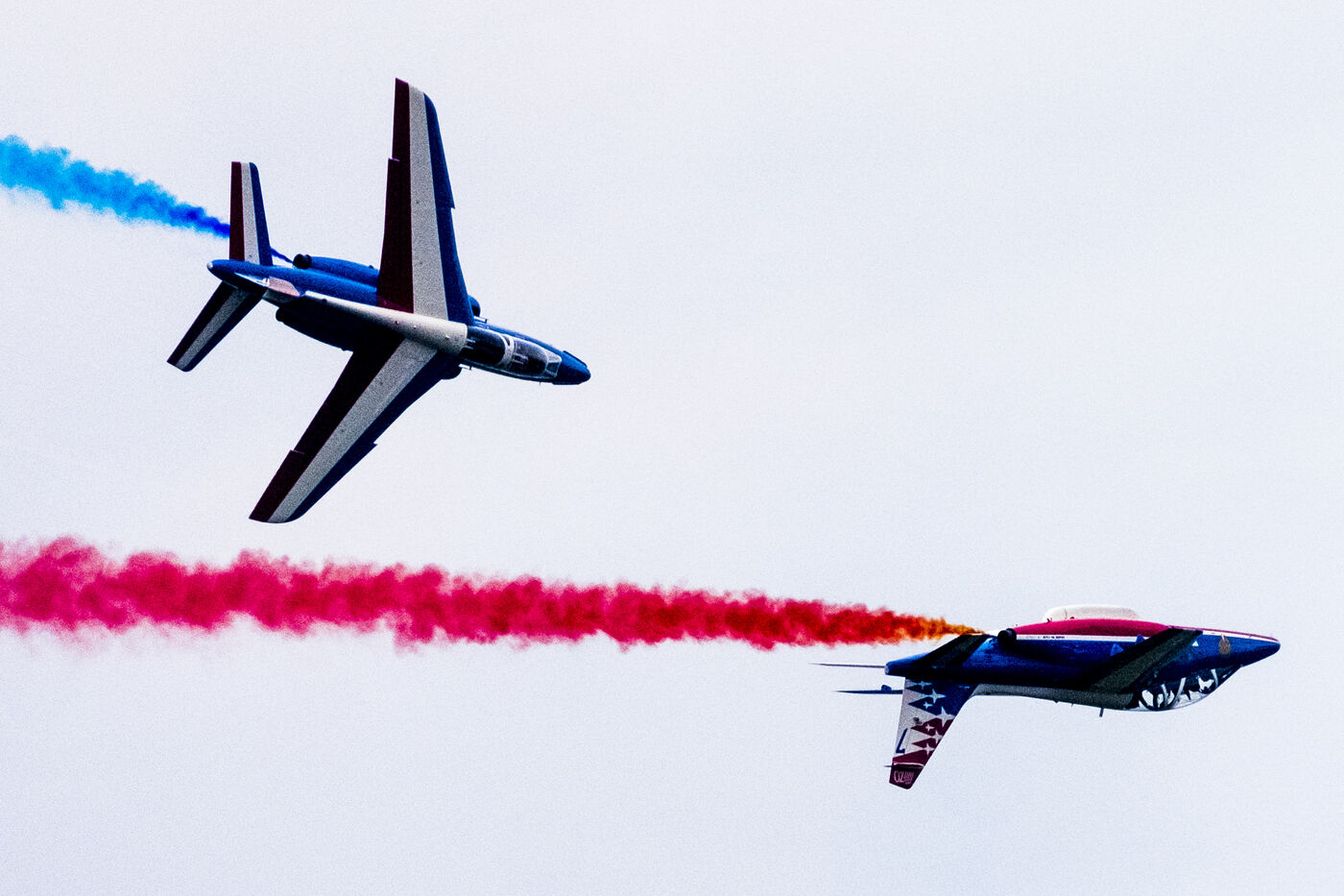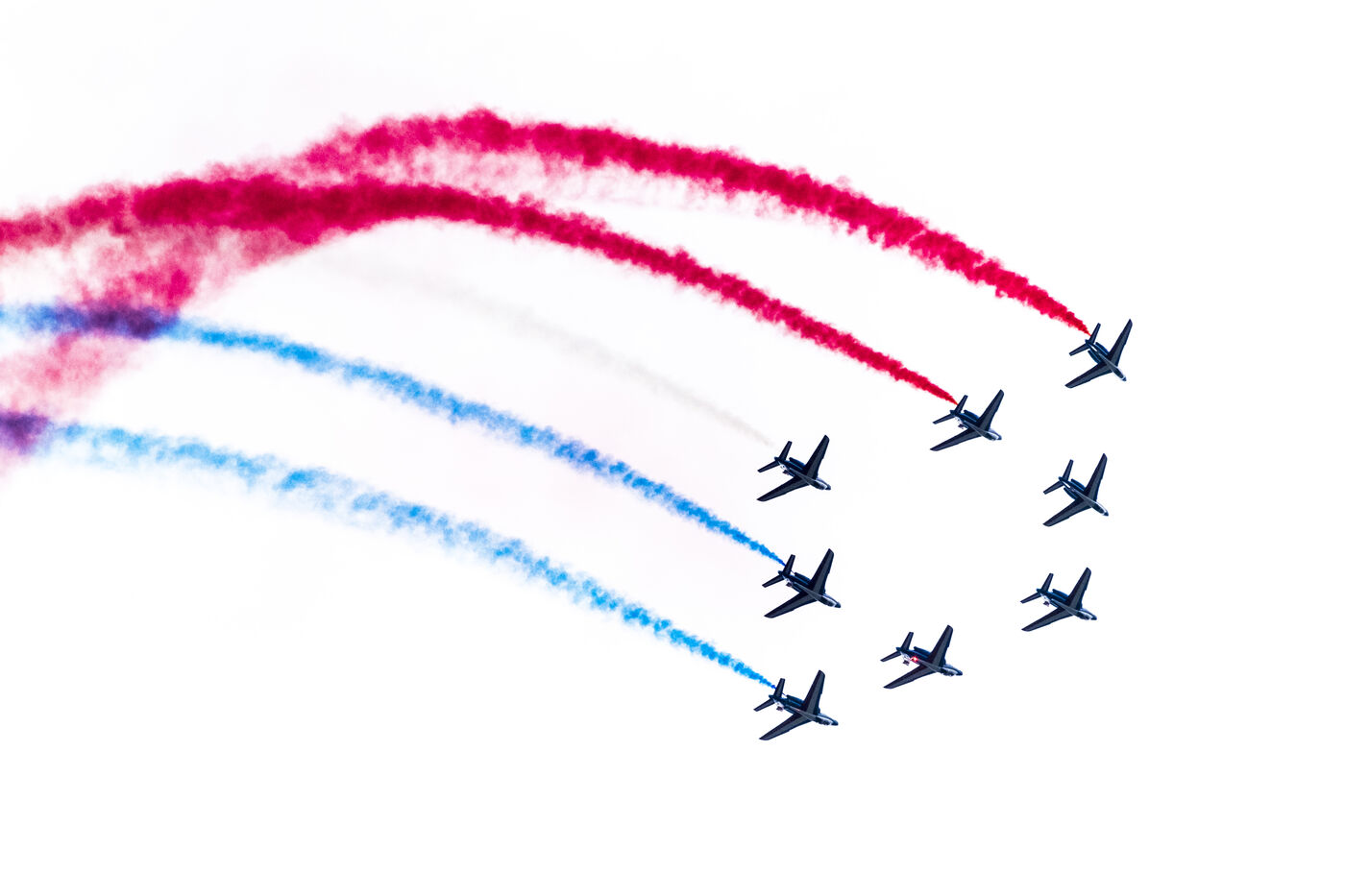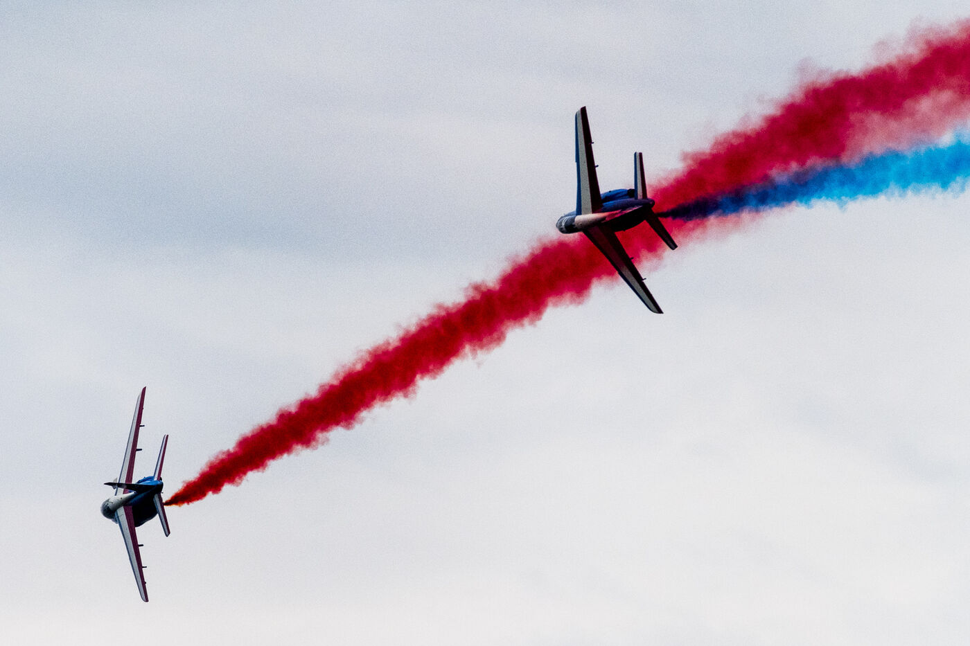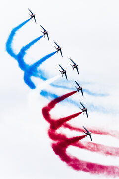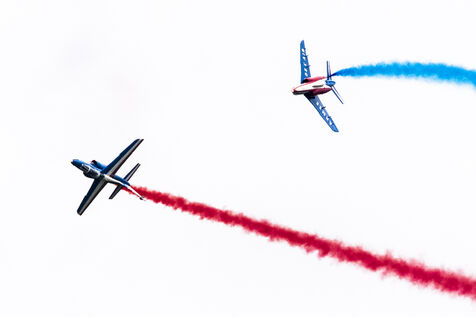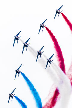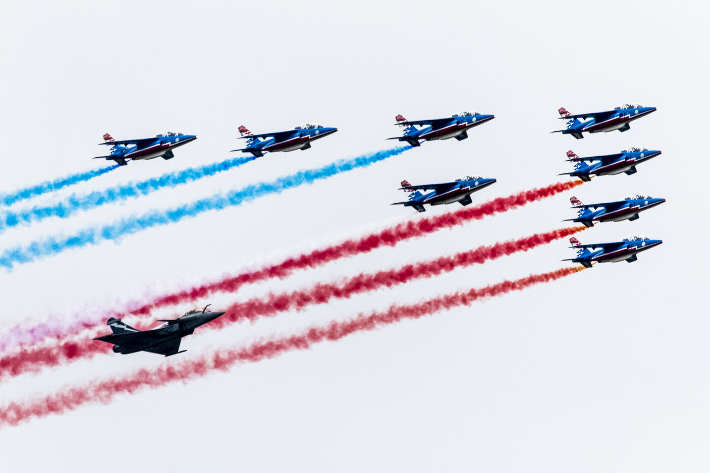 Démonstration aérienne de la Patrouille de France accompagnée d'un Airbus A400M. La BA 701 de Salon de Provence accueillait un événement aéronautique de grande ampleur. Réalisé à l'occasion des 70 ans de la patrouille de France, le meeting national de l'Air était organisé au profit de la Fondation des Œuvres Sociales de l'Air. 20 Et 21 mai 2023. France