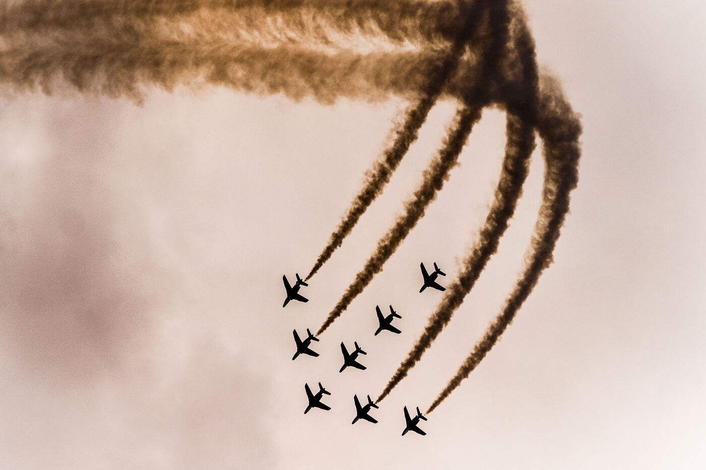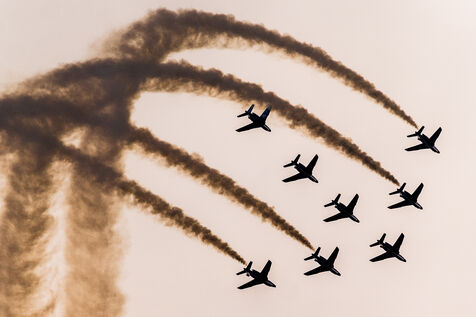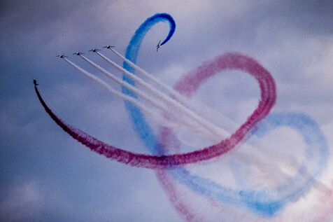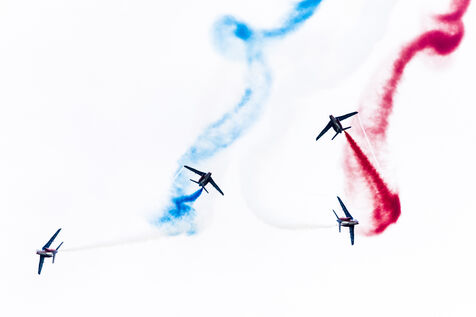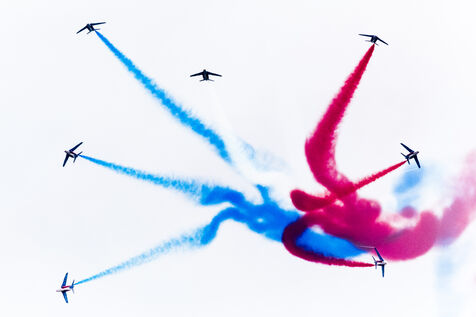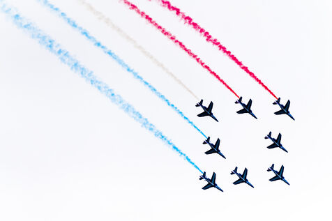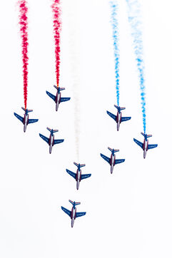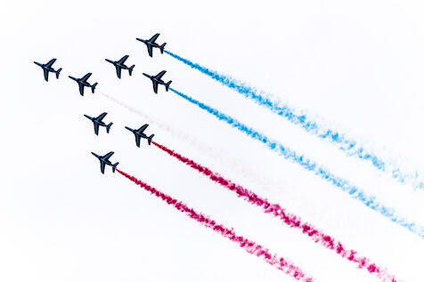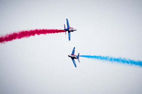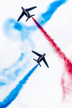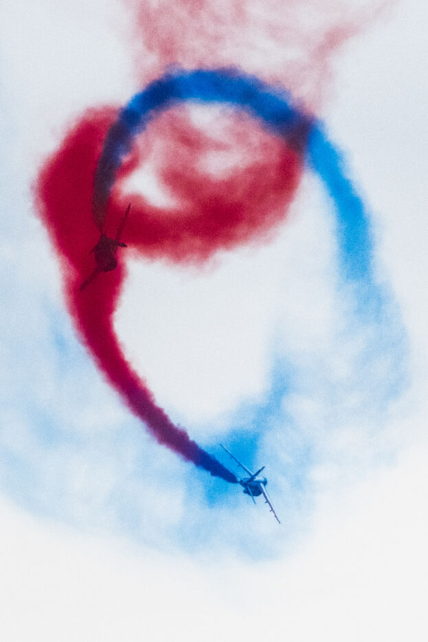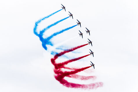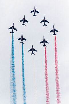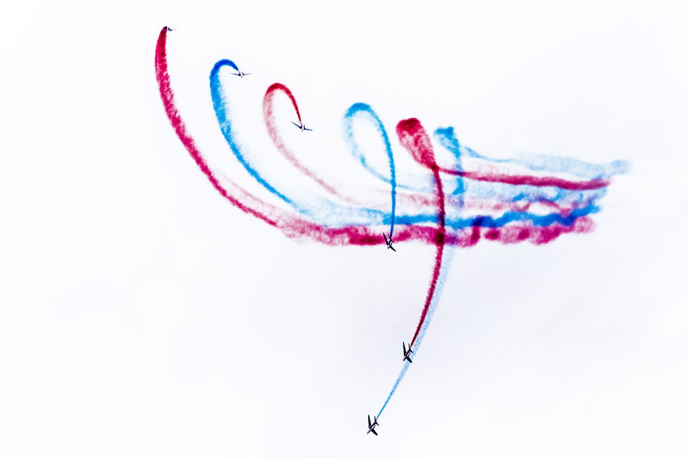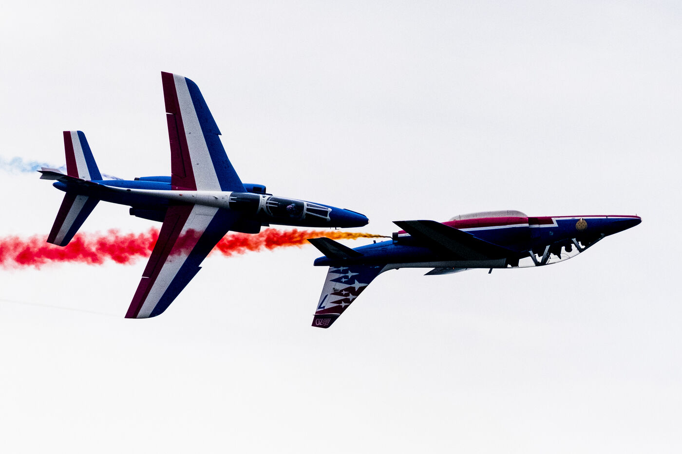 Démonstration aérienne de la Patrouille de France accompagnée d'un Airbus A400M. La BA 701 de Salon de Provence accueillait un événement aéronautique de grande ampleur. Réalisé à l'occasion des 70 ans de la patrouille de France, le meeting national de l'Air était organisé au profit de la Fondation des Œuvres Sociales de l'Air. 20 Et 21 mai 2023. France