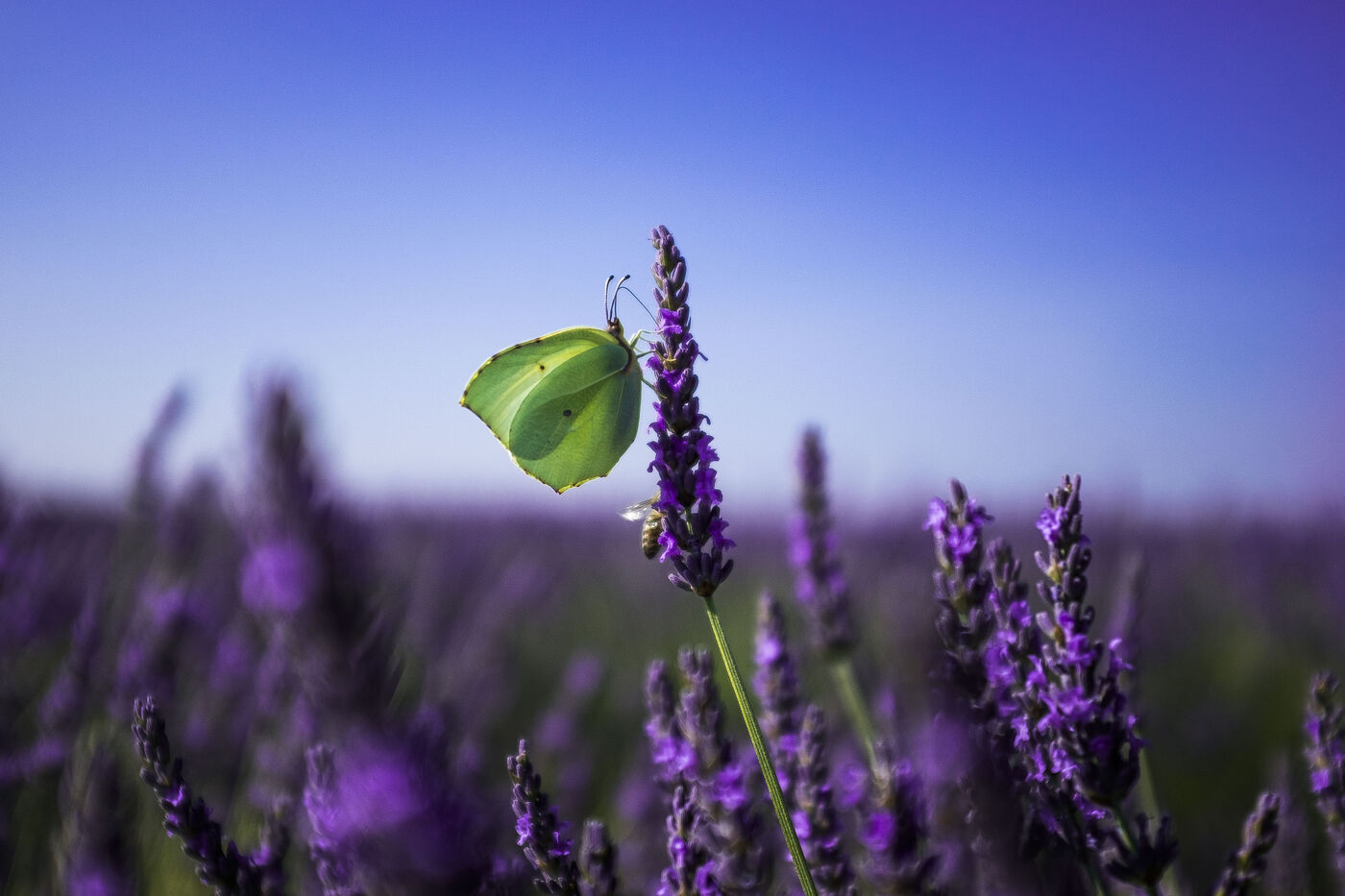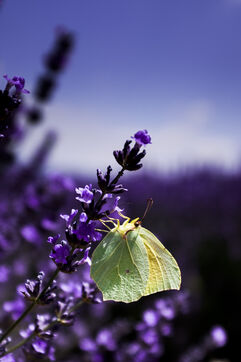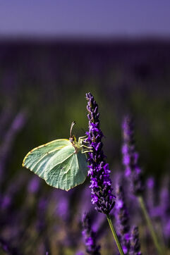 Lemon butterflies in the lavender fields on the Provençal plateau of Valensole, in the Alpes-de-Haute-Provence. France