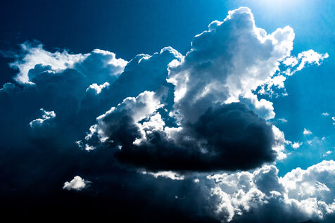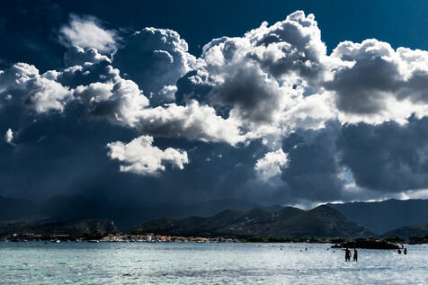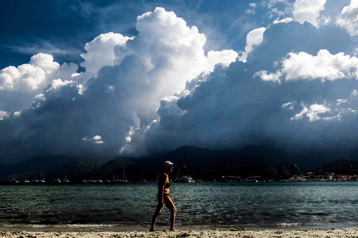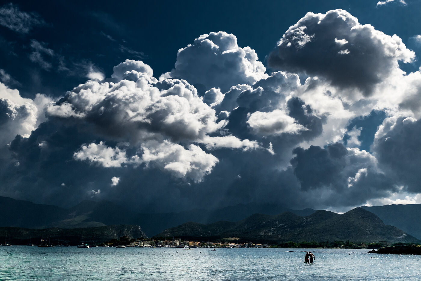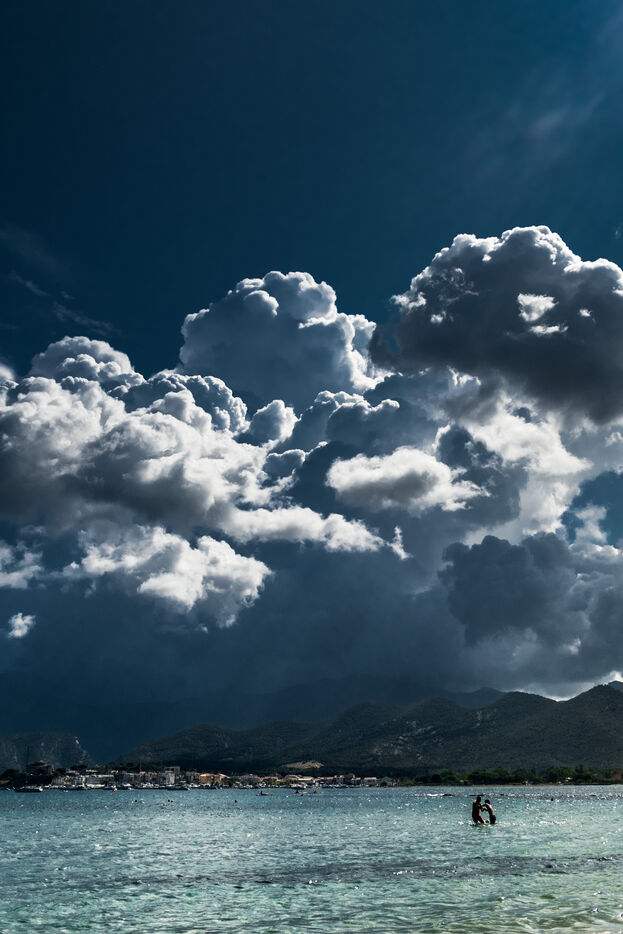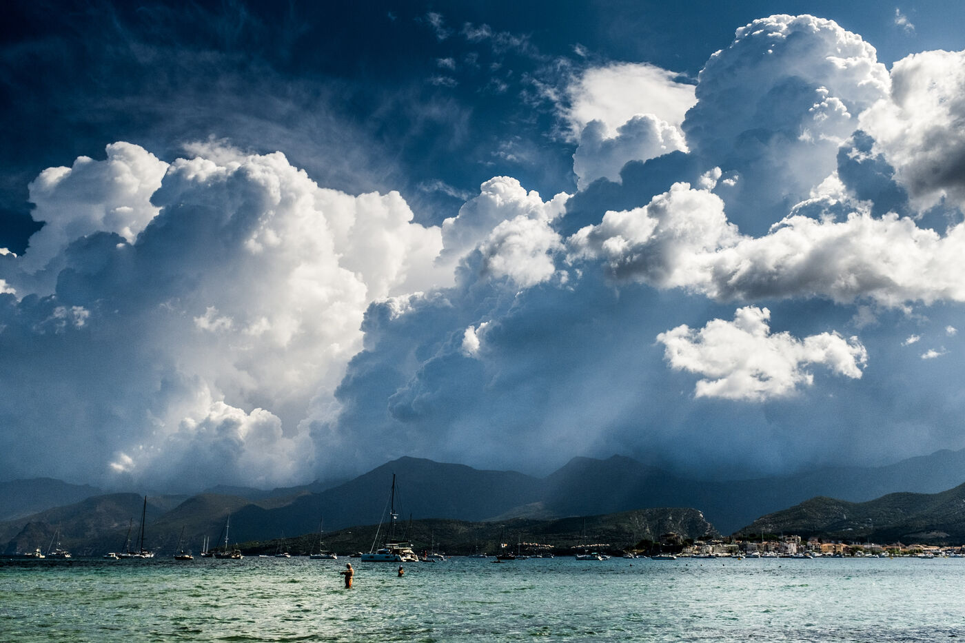 Severe weather with huge cumulonimbus clouds forming swirls atop Cap Corse. With the intense summer heat, a very large cloud and storm front is forming over the cape between Bastia and St Florent. Seen here from Roya beach in St Florent. 03/08/2025