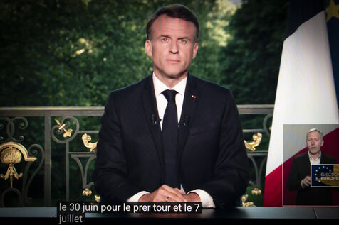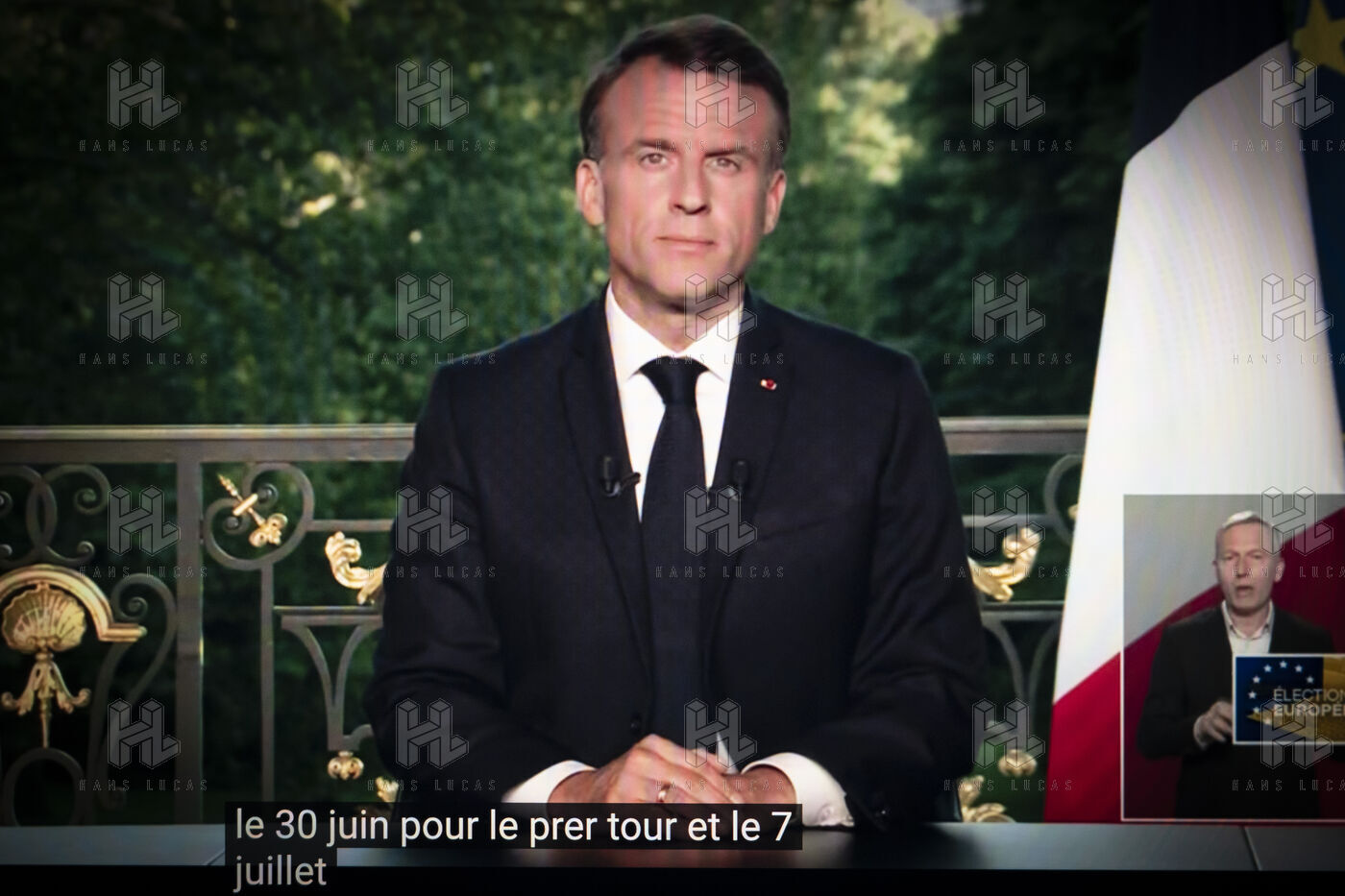 French President Emmanuel Macron speaks live on television (from the Elysee Palace) and announces the dissolution of the National Assembly and the organization of new legislative elections (1st round on June 30, second round on July 07) in Paris, France on June 09, 2024.
