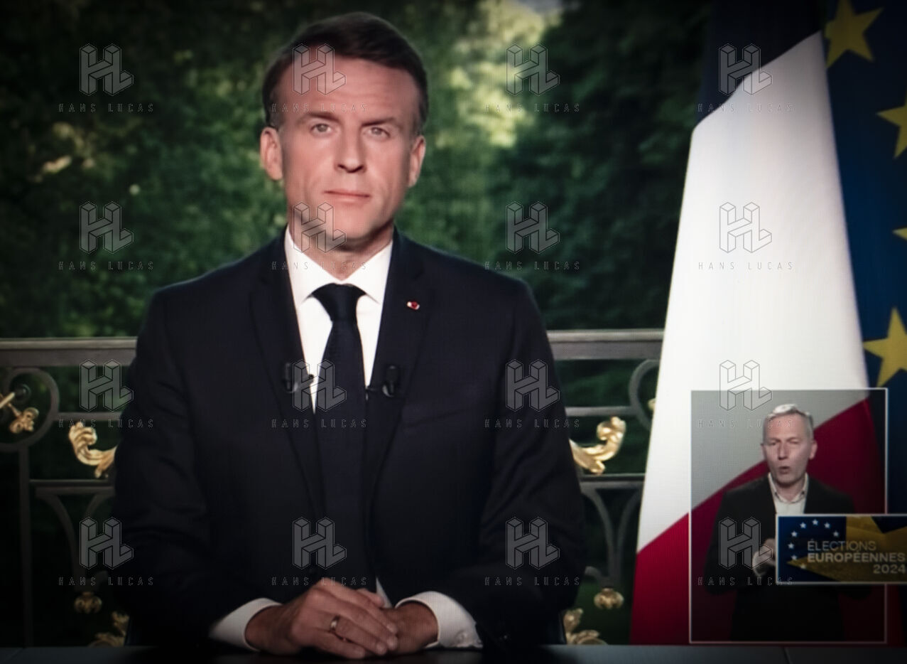 Le president de la Republique francaise Emmanuel Macron prend la parole en direct a la television (depuis le palais de l Elysee) et annonce la dissolution de l assemblee nationale et l organisation de nouvelles elections legislatives (1er tour le 30 juin, second tour le 07 juillet) a Paris, France le 09 Juin 2024.
