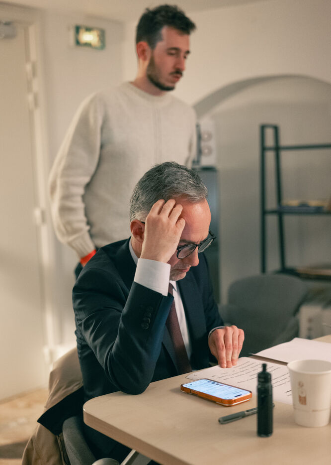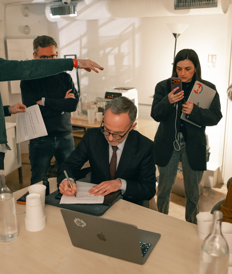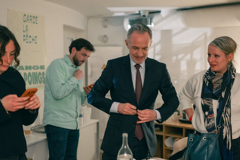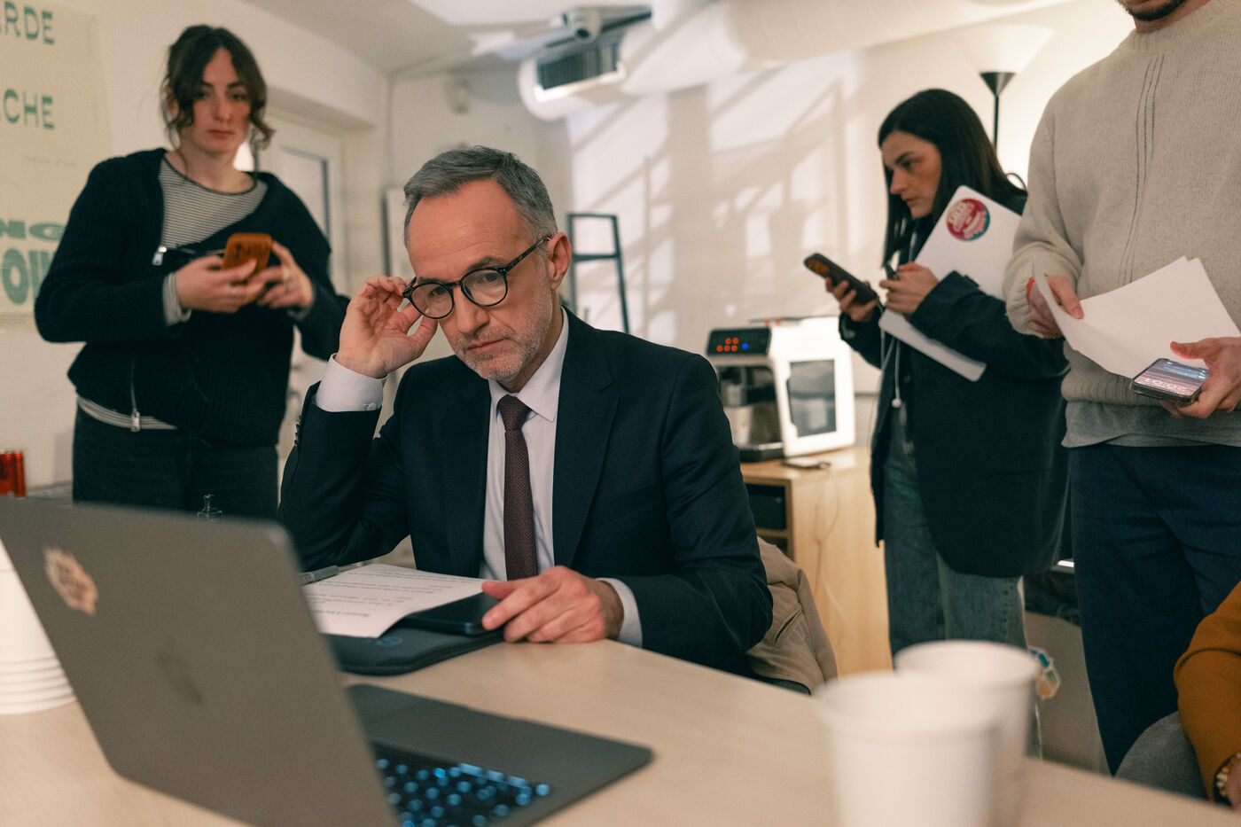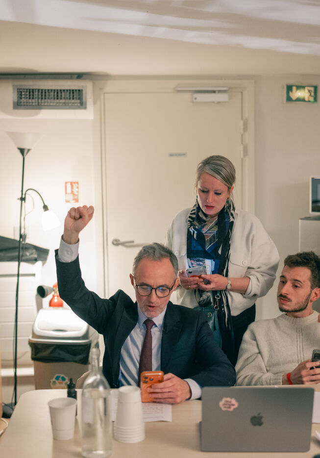 Emmanuel Grégoire learns that he is leading in the first round of the municipal elections with 37.98% of the vote, ahead of right-wing candidate Rachida Dati (25.46%) and LFI candidate Sophia Chikirou (11.72%), at a polling station in La Rotonde, surrounded by his family, friends, and party members.