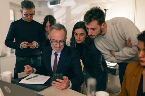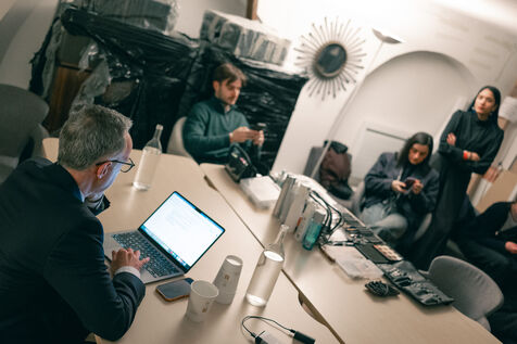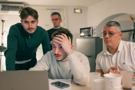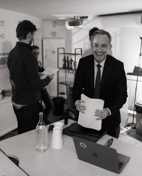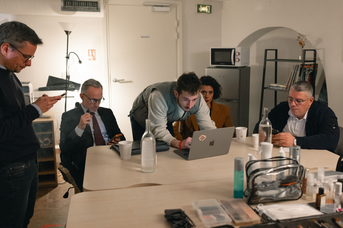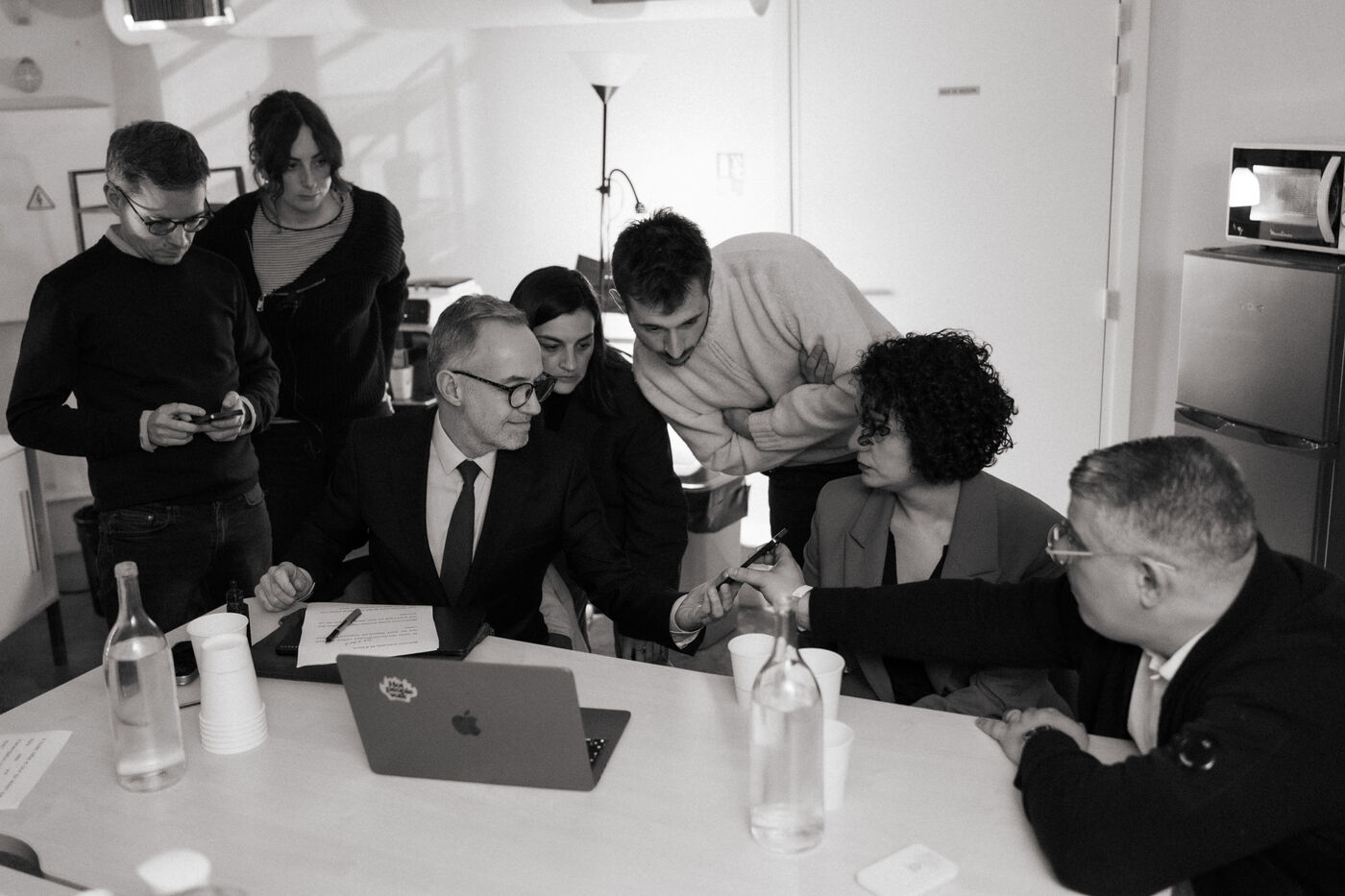 Emmanuel Grégoire learns that he is leading in the first round of the municipal elections with 37.98% of the vote, ahead of right-wing candidate Rachida Dati (25.46%) and LFI candidate Sophia Chikirou (11.72%), at a polling station in La Rotonde, surrounded by his family, friends, and party members.