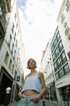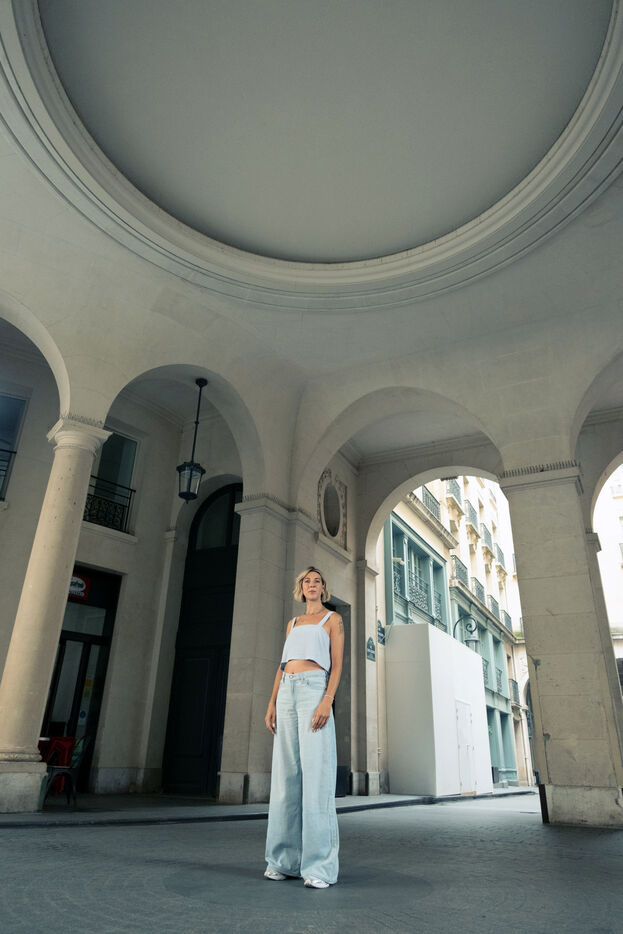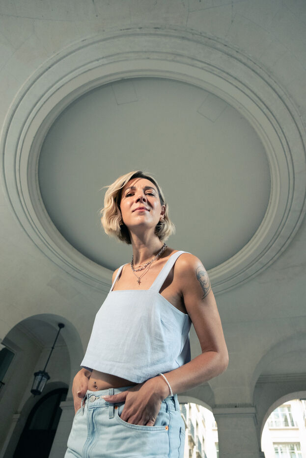 Portrait of Camille Lorente, comedian and content creator: journalist turned stand-up comedian, podcaster and videographer in Paris France on June 26 2025.