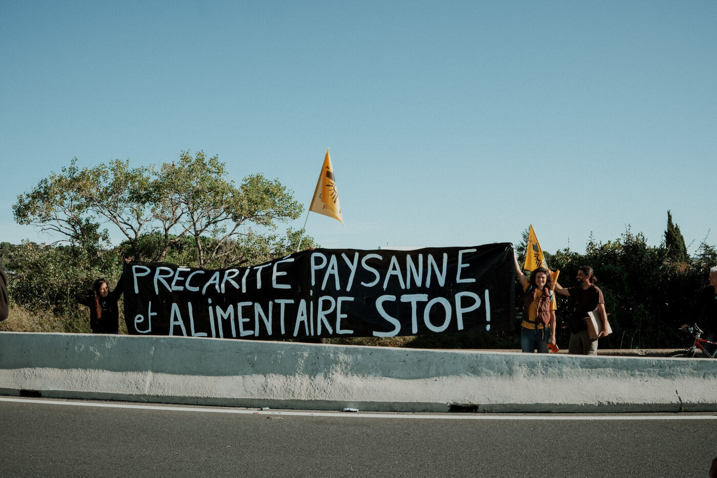 Mobilisation de plusieurs personnes dont la confédération paysanne locale devant le péage du Boulou, dernier péage avant l'Espagne sur l'autoroute A9 pour la journée de manifestation nationale du 10 septembre "Bloquons tout".