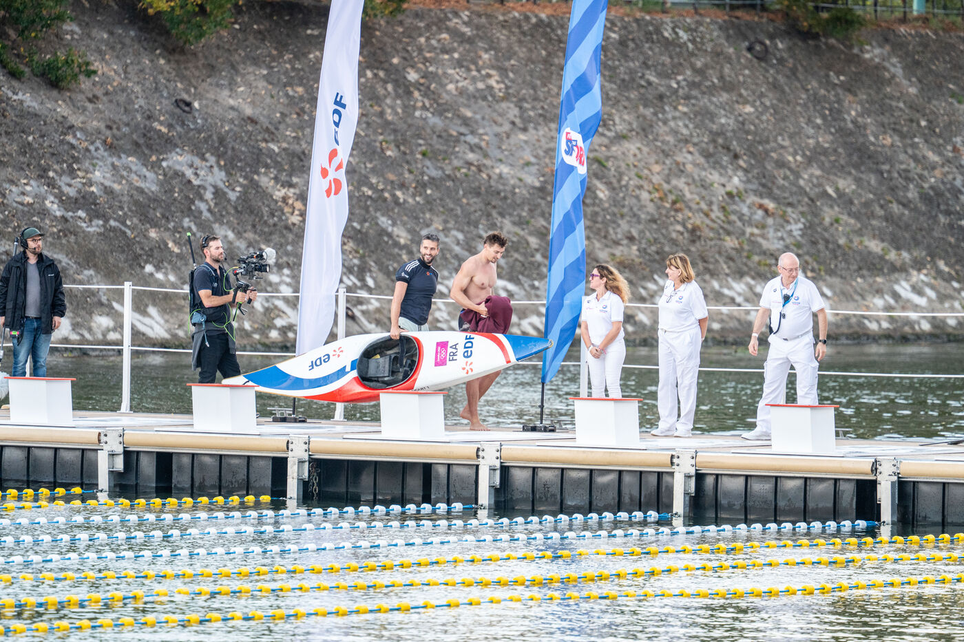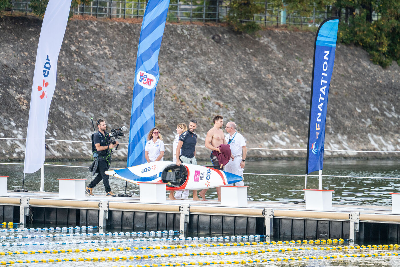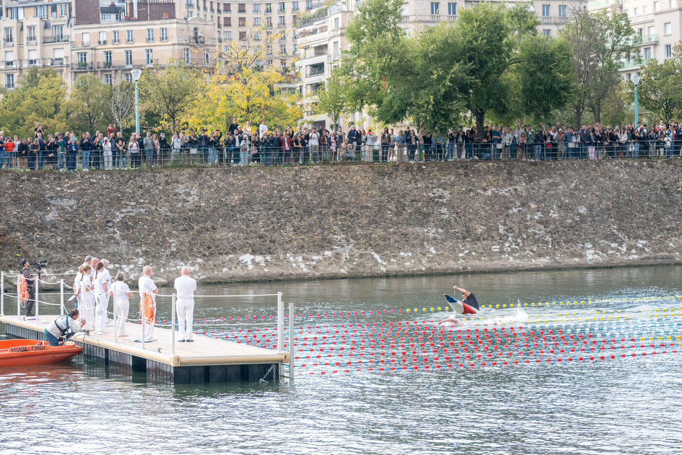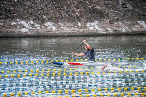 During the Open EDF sur Seine competition, French athlete Tony Estanguet, three-time Olympic canoeing champion, and Maxime Grousset, French world champion in the 100m butterfly, took on a challenge combining their two sporting specialties to lead a sprint race over 100 meters. This event was part of the first edition of the Sports Festival announced by French President Emmanuel Macron during the Paris 2024 Olympic Games, held on the Grenelle basin in the Seine in Paris. The event was held in the presence of Marie Barsacq, Minister of Sports, Youth and Community Life, and Amélie Oudéa-Castéra, President of the French National Olympic and Sports Committee.