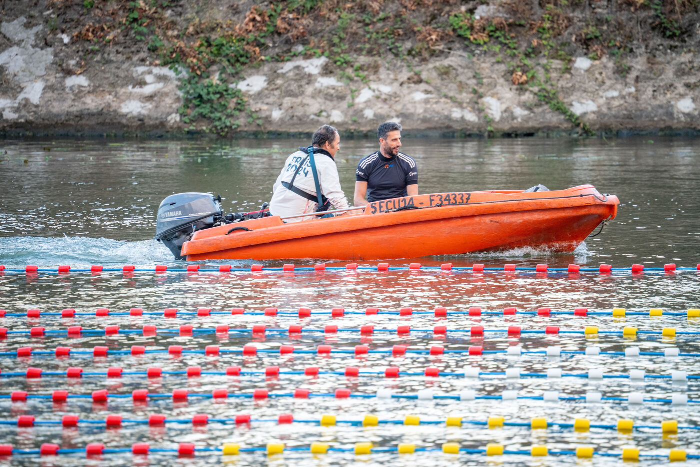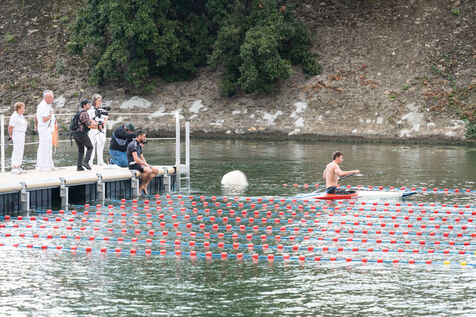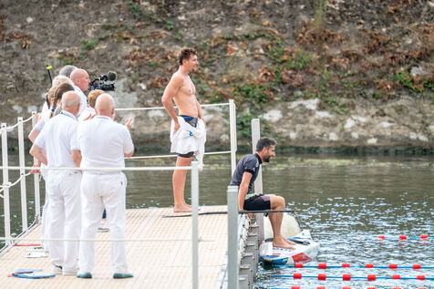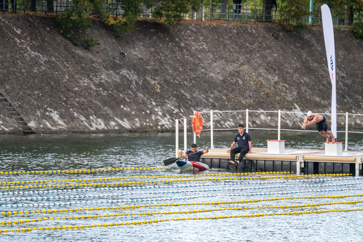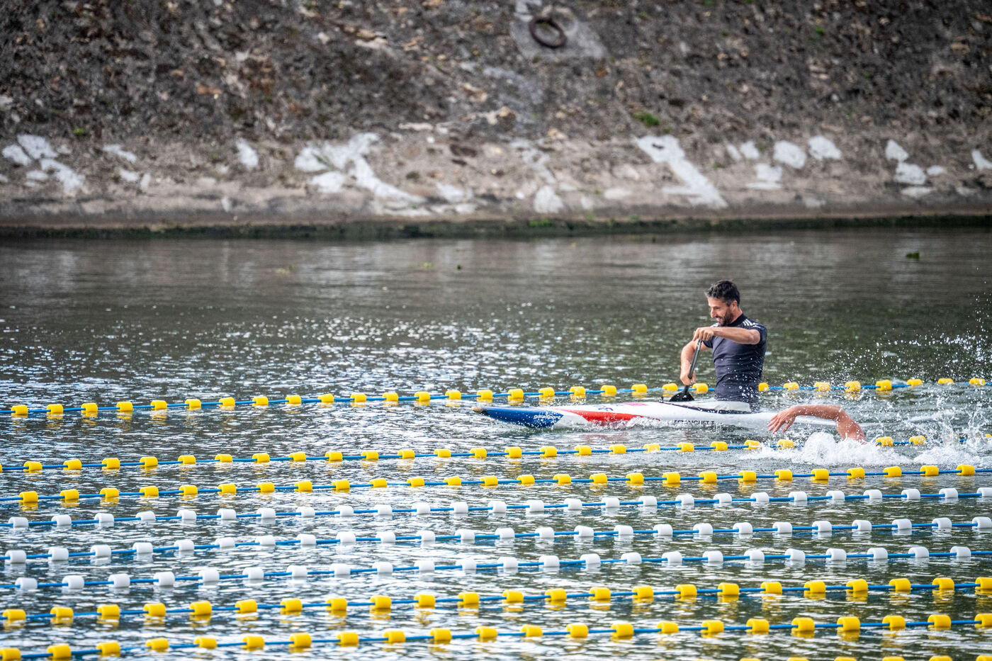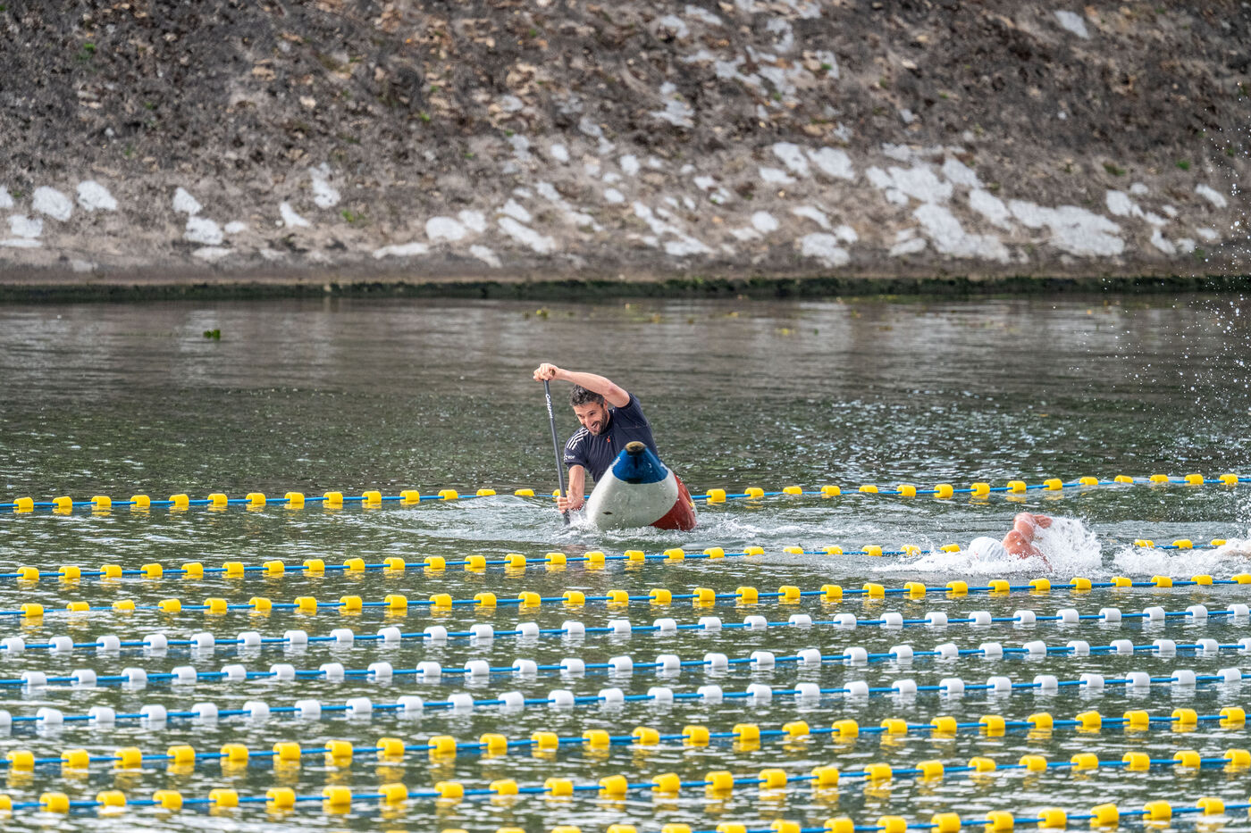 During the Open EDF sur Seine competition, French athlete Tony Estanguet, three-time Olympic canoeing champion, and Maxime Grousset, French world champion in the 100m butterfly, took on a challenge combining their two sporting specialties to lead a sprint race over 100 meters. This event was part of the first edition of the Sports Festival announced by French President Emmanuel Macron during the Paris 2024 Olympic Games, held on the Grenelle basin in the Seine in Paris. The event was held in the presence of Marie Barsacq, Minister of Sports, Youth and Community Life, and Amélie Oudéa-Castéra, President of the French National Olympic and Sports Committee.