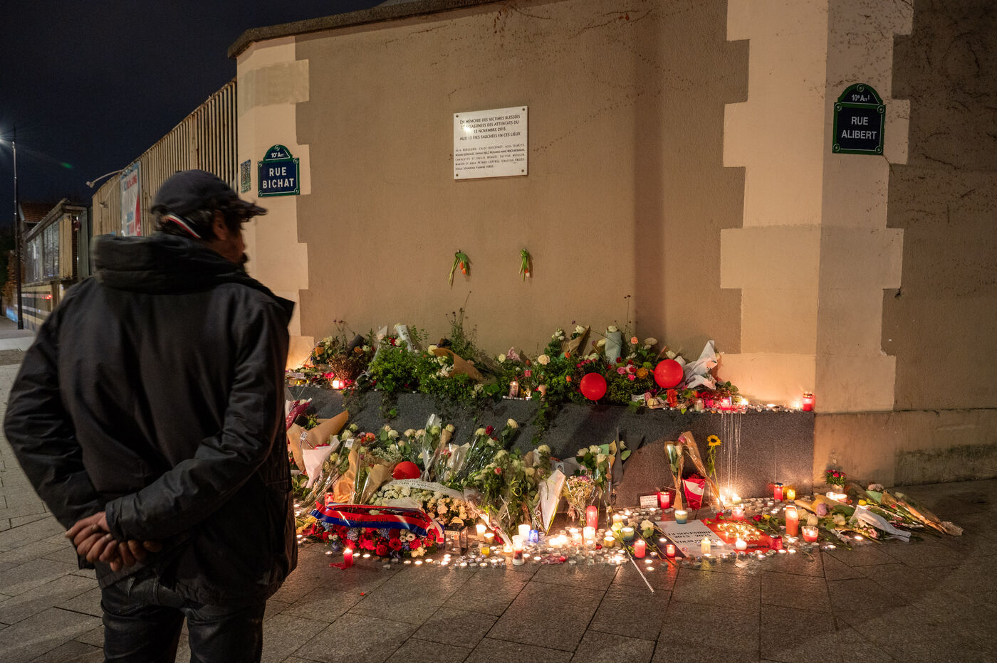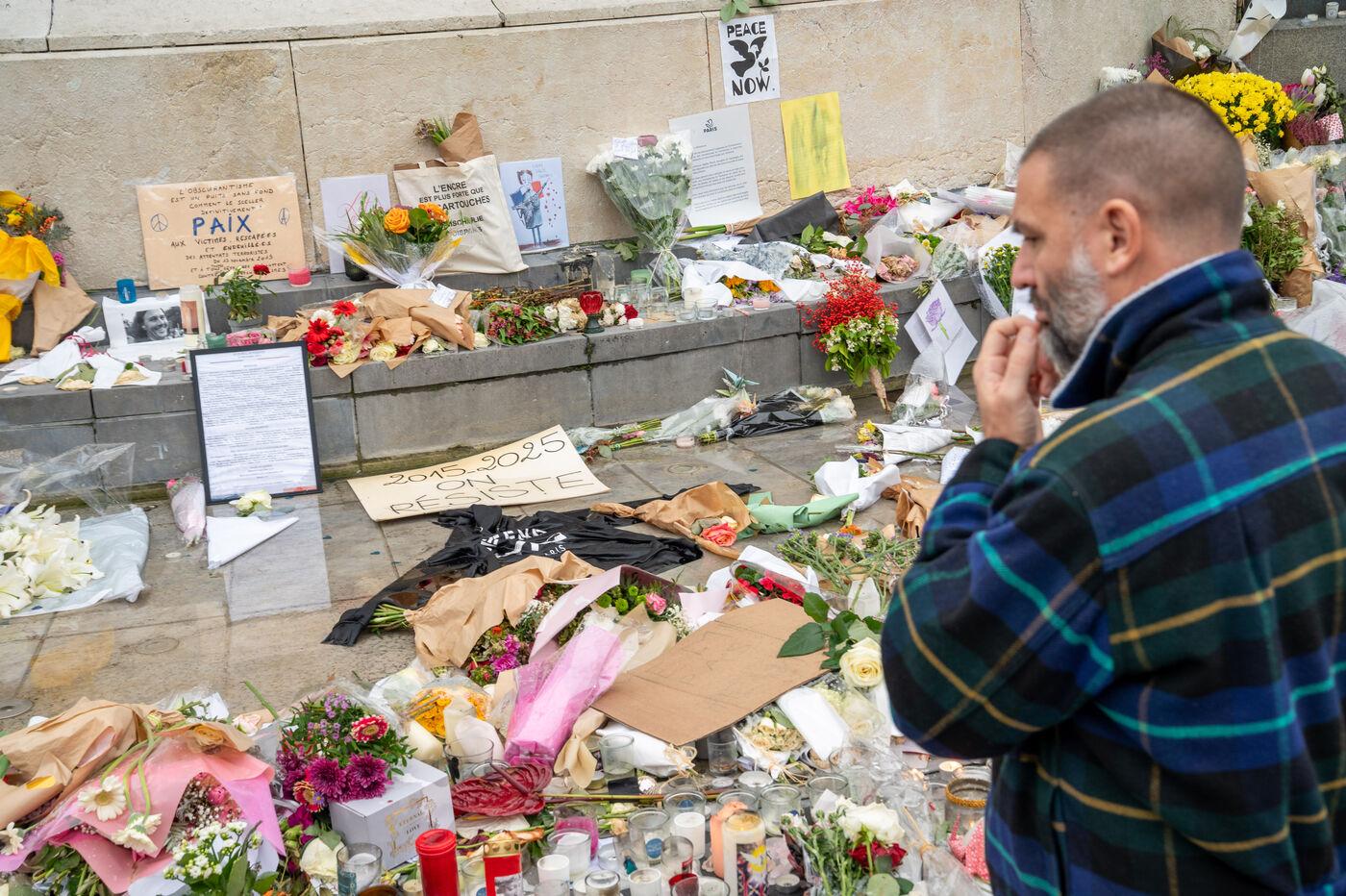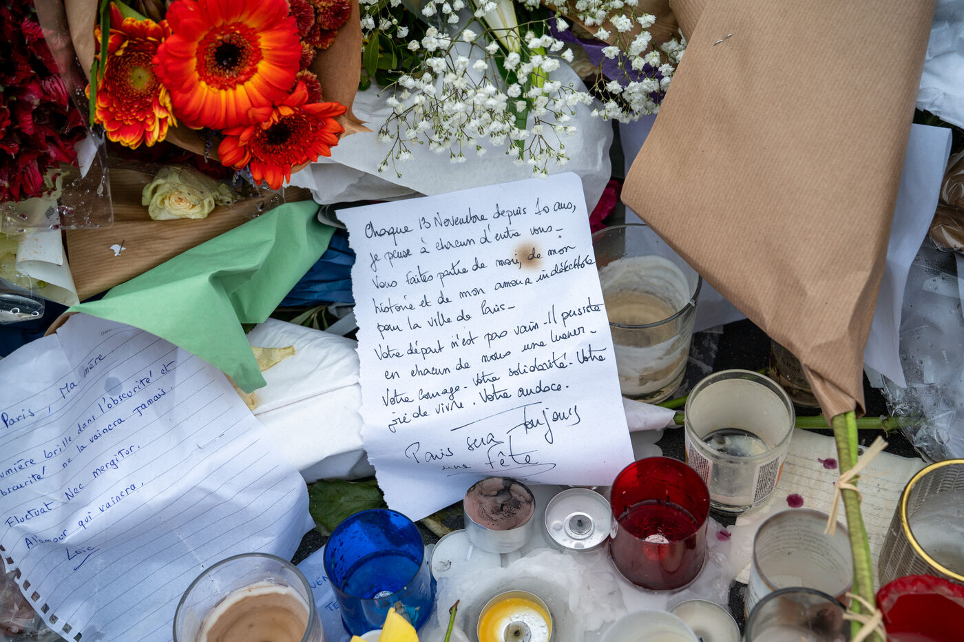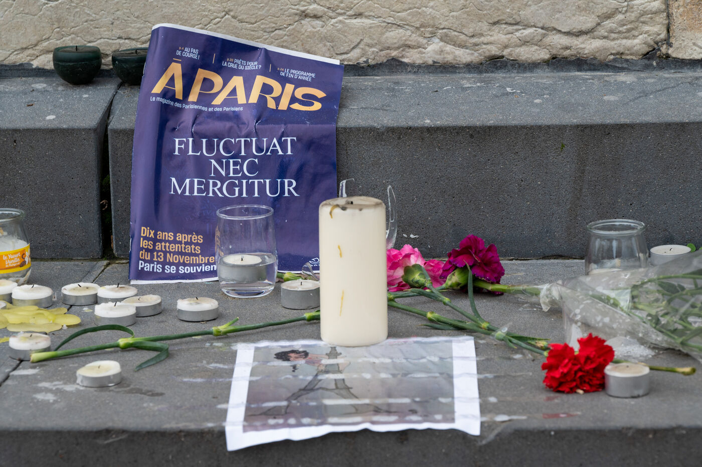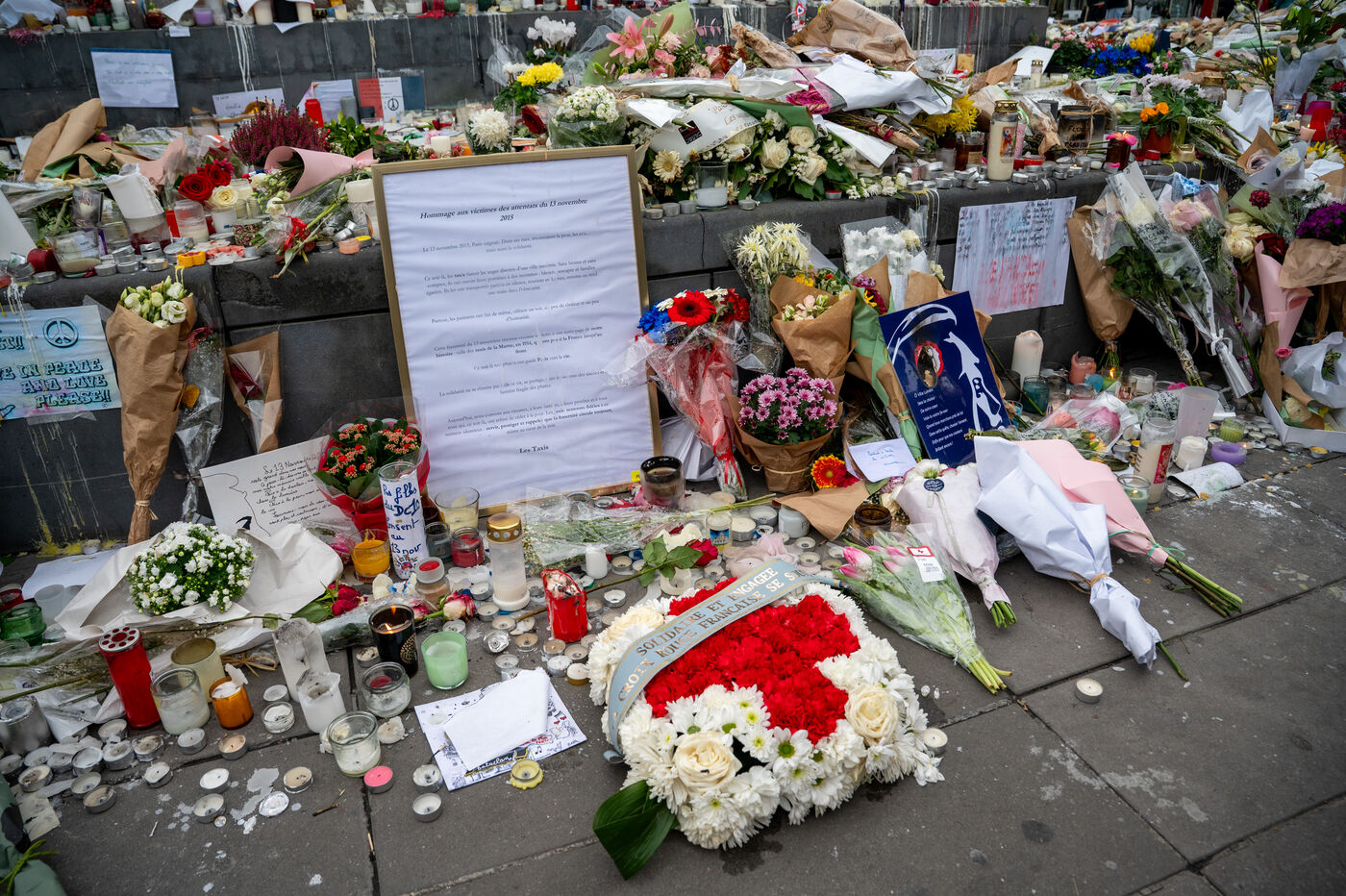Fleurs et bougies, messages d'amour et d'amitié, commémorations spontanées et manifestations officielles se déroulent 10 ans après les attentats terroristes meurtrier de 2015 dans plusieurs lieux symboliques de la ville de Paris, dont la Place de la République, à proximité de la Mairie de Paris avec l'inauguration d'un monument pour toutes les victimes ou encore sur les différents sites touchés mortellement dans la capitale.