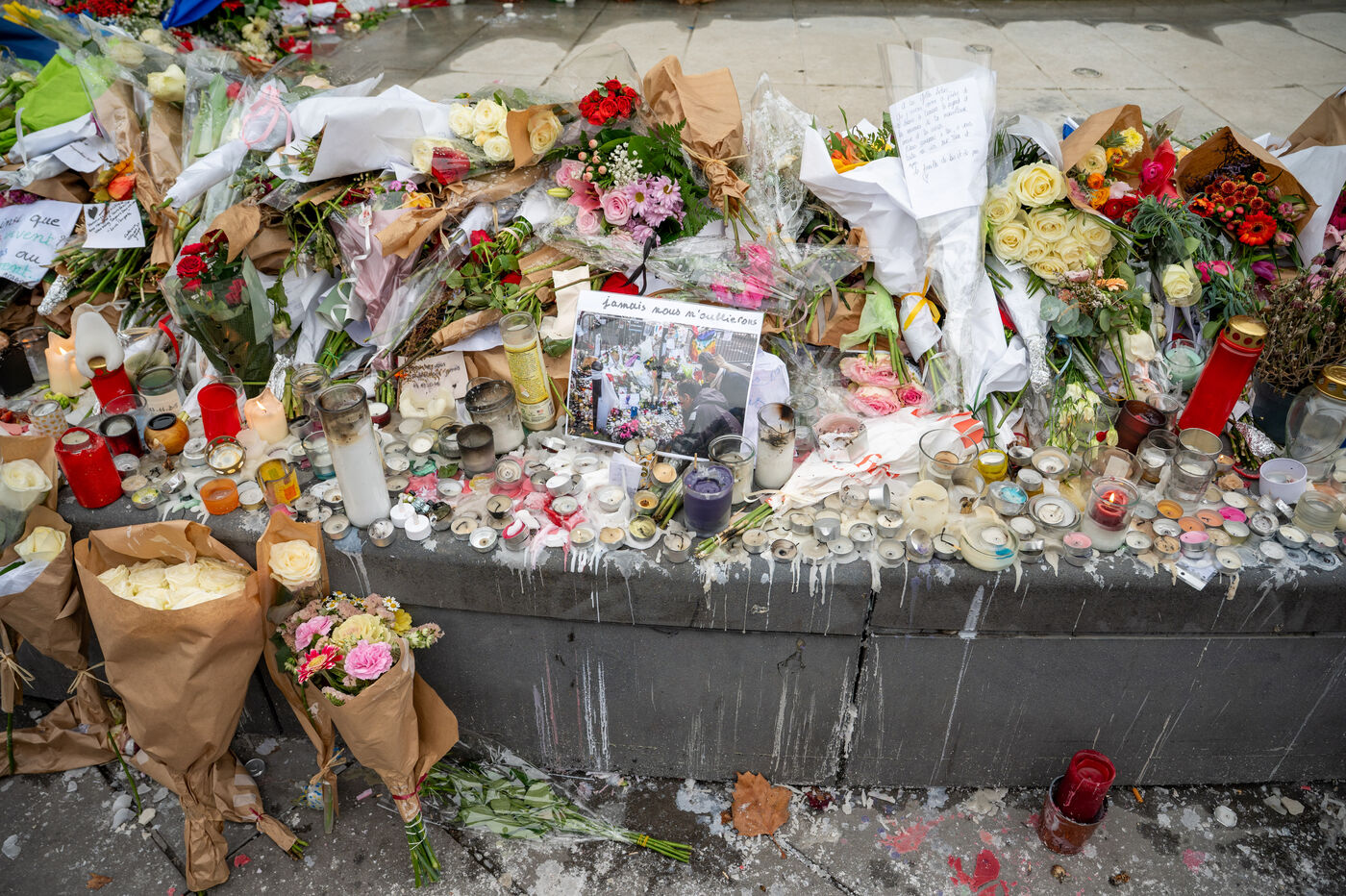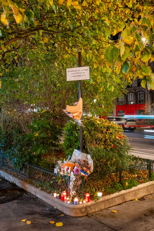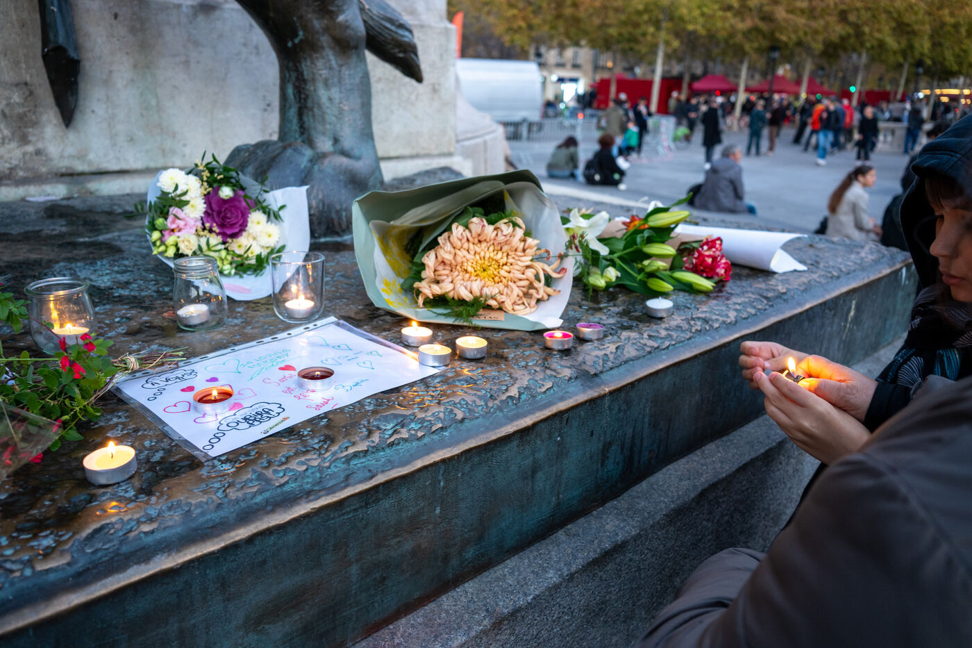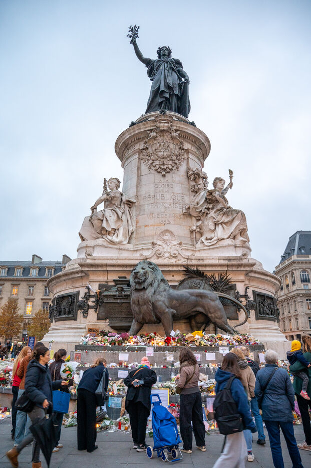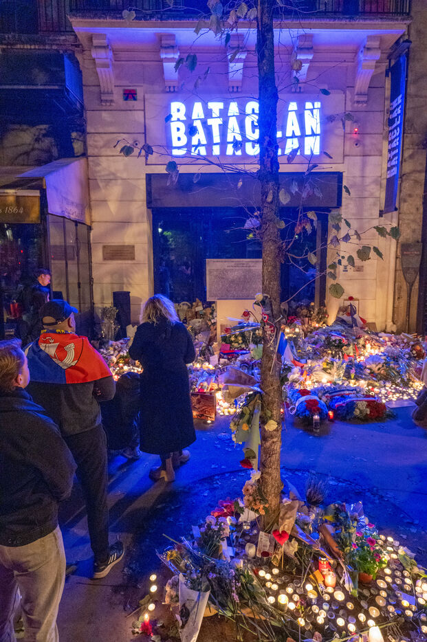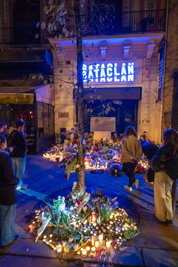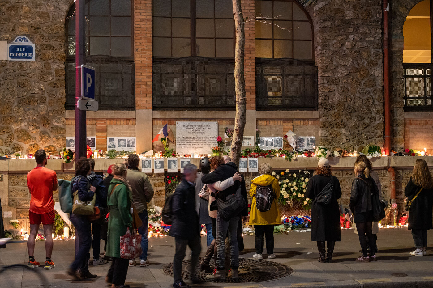 Fleurs et bougies, messages d'amour et d'amitié, commémorations spontanées et manifestations officielles se déroulent 10 ans après les attentats terroristes meurtrier de 2015 dans plusieurs lieux symboliques de la ville de Paris, dont la Place de la République, à proximité de la Mairie de Paris avec l'inauguration d'un monument pour toutes les victimes ou encore sur les différents sites touchés mortellement dans la capitale.